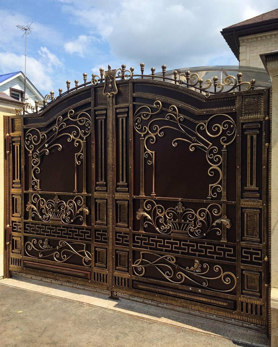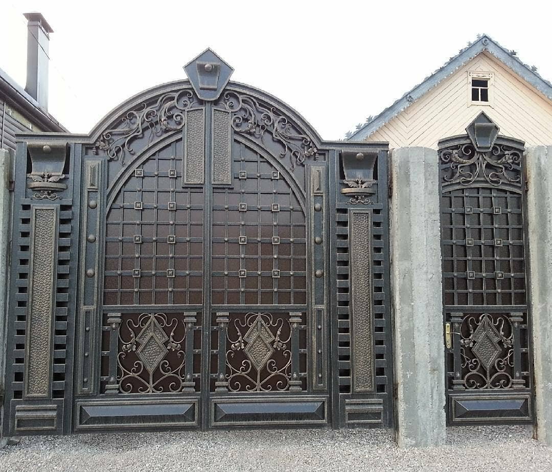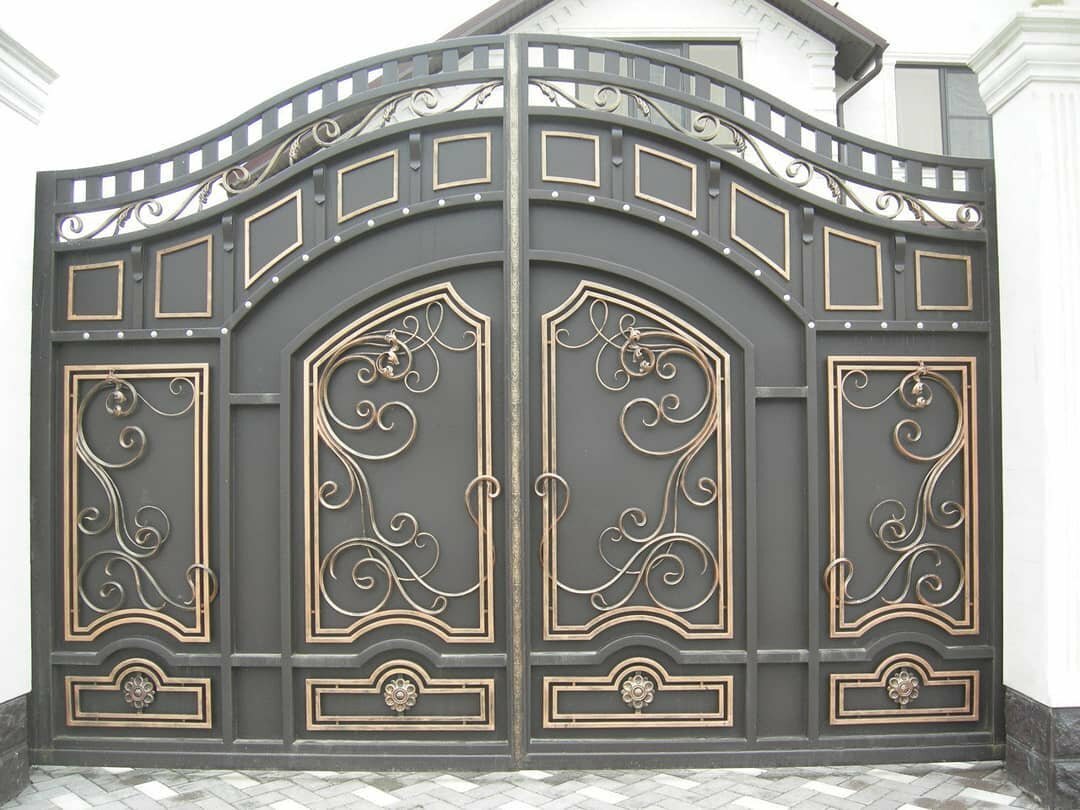 Метал ворота на заказ гаражные и въездные, ровные и витые, сложные и простые, несложные и кованые металлические ворота с замечательной ковкой оригинальной в мастерском исполнении дизайнерского подхода, дорогие и дешевые бюджетные, ровные и арочные, глухие с прозрачными смотровыми решетками, гаражные в гараж а дверью, автоматические въездные во двор с калиткой, с пиками, со столбиками. Купить просто с профлиста и кованые ворота откатные, распашные, подъемные, сдвижные. Можно выбрать металл 3 мм, 2 мм, 1,5 мм, каркас и профлист, цвета, замки, задвижки. Иллюстрация работ на фото строительного сайта 004.