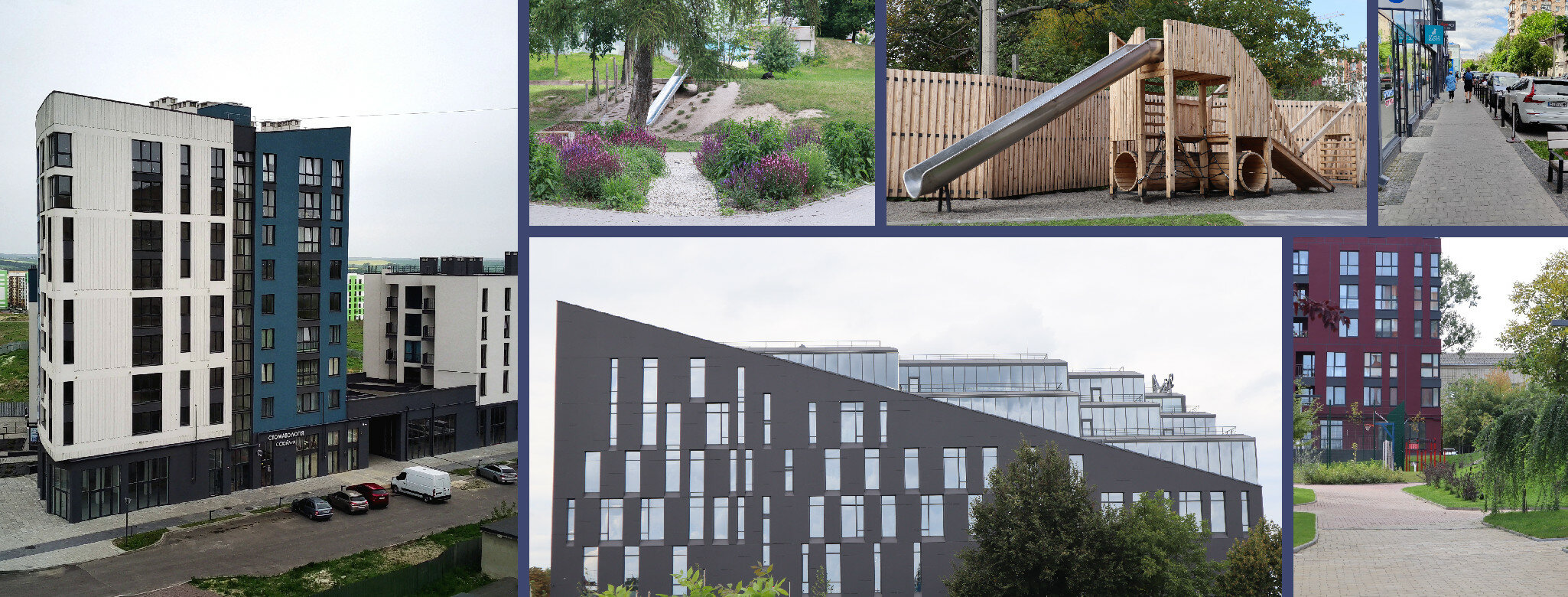 Три будинки 2023 року, фото в травні зроблені. Всі 9-поверхові, цегляні. Двір без автомобілів, багато озеленення (дерева, кущі, квітники), нормальні дитячий і спортивні майданчики (+ баскетбольне поле). Безбар'єрність починаючи від понижень тротуарів і закінчуючи вхідними групами. По зовнішньому периметру будинків - паркінги. Ліфт відразу за вхідними дверима, двосторонній, їде навіть пів поверху з 0-го на 1-й. На стінах файна декоративна штукатурка, на підлозі та сходах непогана плитка. Коридорі широкі, ніде нема страшних ящиків для комунікацій (як це буває в деяких новобудовах). Прибудинкова територія, загалом, дуже добре спланована, з хідниками "напряму" там де треба, пониженнями, тротуари перетікають у тротуари по інший бік пішохідних переходів, а не в тупики, як це бувало раніше.