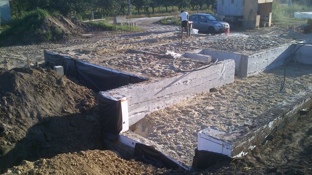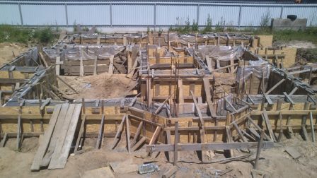 SamStroil Опубліковано: 25 січня 2013 Автор Поділитись Опубліковано: 25 січня 2013 Прошло 2 недели. Сняли опалубку (в некоторых местах пришлось подопалубить обрушеный грунт, а в месте перехода с одной глубины ленты на другую устроить ступенчатый фундаметн уступами по 20см) И начали строить опалубку фундаментных стен. По ходу обтягивали ПЭ пленкой, благо был источник б/у тепличной пленки, частично пошла пленка оставшаяся от ленты. На наружную стенку по кругу навесили 50мм ППС 35 плотности (ГОСТ) с таким расчетом, чтобы после разопалубки ППС оказался снаружи укрытым пленкой (черная для фундаментов). В листы ППС предварительно втыкали пластиковые грибки. Вообще-то пенопласт к бетону приклеивается так, что не отдерешь, но лишним, пожалуй, не будет. вяжем и подвешиваем арматуру верхнего пояса 4*ф12 25*20 После финальной проверки осей и окончательного раскрепления опалубки заказываем бетон и льем. За два захода. Все-таки высота стен немаленькая. Опять бетононасосом. Через пару дней потихоньку начинаем убирать подпорки. Глядя в образовавшийся бассейн, задумываюсь - чем засыпать? Ну, хотя бы грунтом из ямы для септика. Делаем, все равно когда-то придется: через две недели с чем-то убираем внутреннюю часть опалубки, сразу же засыпаем грунтом, трамбуем, опять засыпаем, завозим пару-тройку КамАЗов песка на последний слой, опять трамбуем. В процессе снимать некогда - бегал как ошпаренный. Аренда виброноги стоит дорого, да и "желтый трактор" недешев. В конце можно чуть расслабиться и снять для истории. Чтобы не гулять, бригада роет траншеи для канализации А я тем временем по вечерам и за выходные развожу канализацию по дому. Во-первых, объяснять дольше, чем сделать самому, во-вторых все равно контролировать уклоны, следить, чтобы не было натягов и тому подобное в процессе нужно постоянно, а в-третьих - стремная вещь -уйдет под стяжку, не дай Бог что-то не так... Короче, лучше я сам. Процесс то ли не снимал, то ли куда-то закатились снимки.. Короче, найдутся - выложу. Траншеи внутри дома засыпали, застелили все той же пленкой для полов и фундаментов и залили черновую стяжку. Алилуйя! Опять идем считать бабки... 5 Посилання на коментар Поділитися на інших сайтах More sharing options...