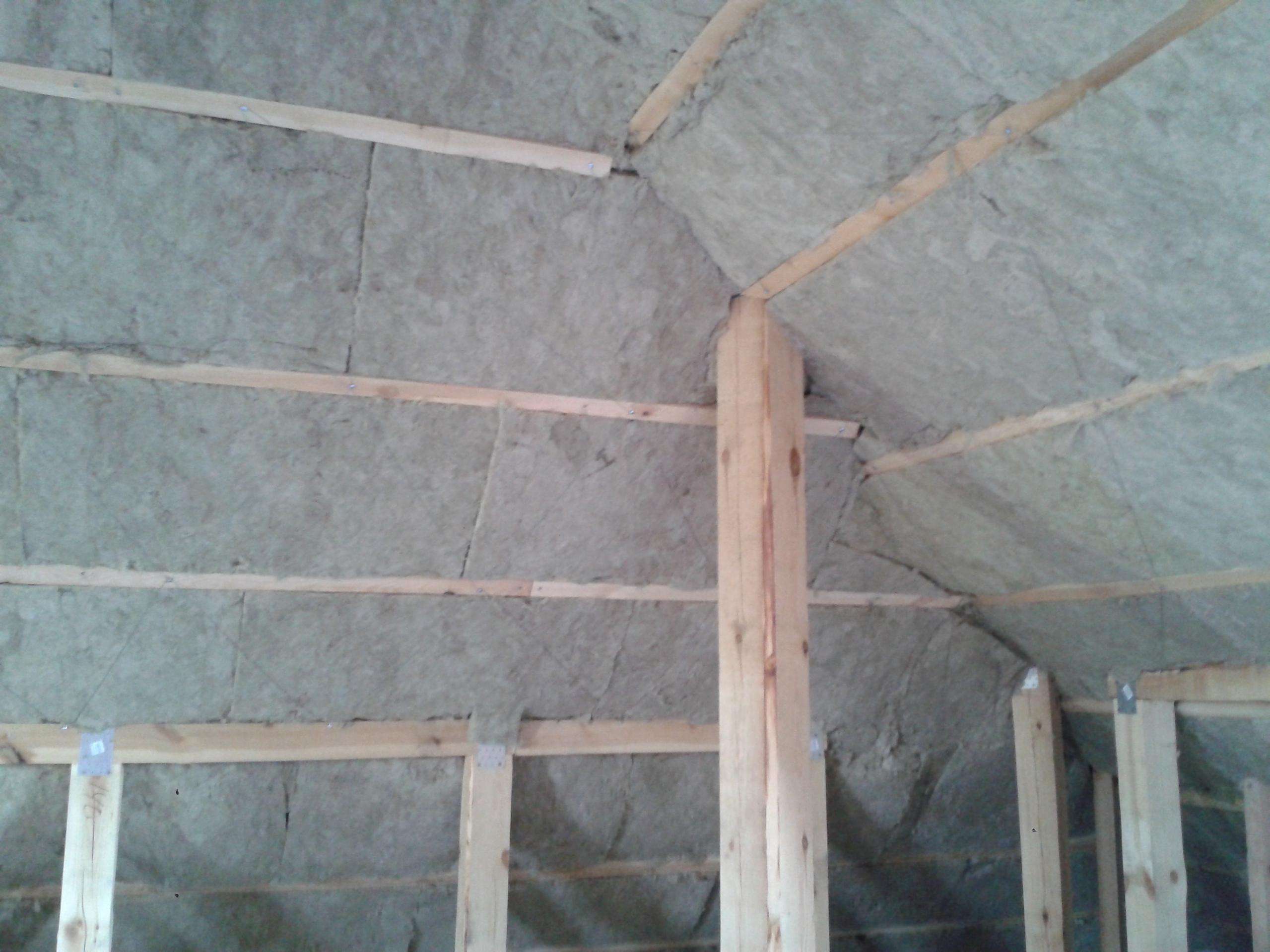 И вот утеплитель уже уложен, 2 по 100 мм шахматкой между стропил и 50 мм внахлест с отсечением самих стропил.