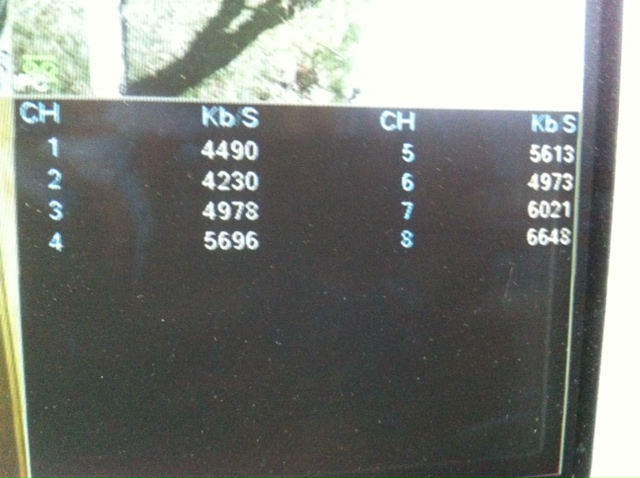 LM Опубліковано: 20 березня 2015 Поділитись Опубліковано: 20 березня 2015 Игры с потоком Подключил 8-ю камеру, показывают все 8, в 2-х выставлено разрешение 1080Р, в остальных - 3МР, в последней - поток максимальный Режим отображения -Вид9, т.е. 9 окон, в 8-ми - изображеия с камер, в 9-м - поток (именно это 9-е окно на фото) Посилання на коментар Поділитися на інших сайтах More sharing options...