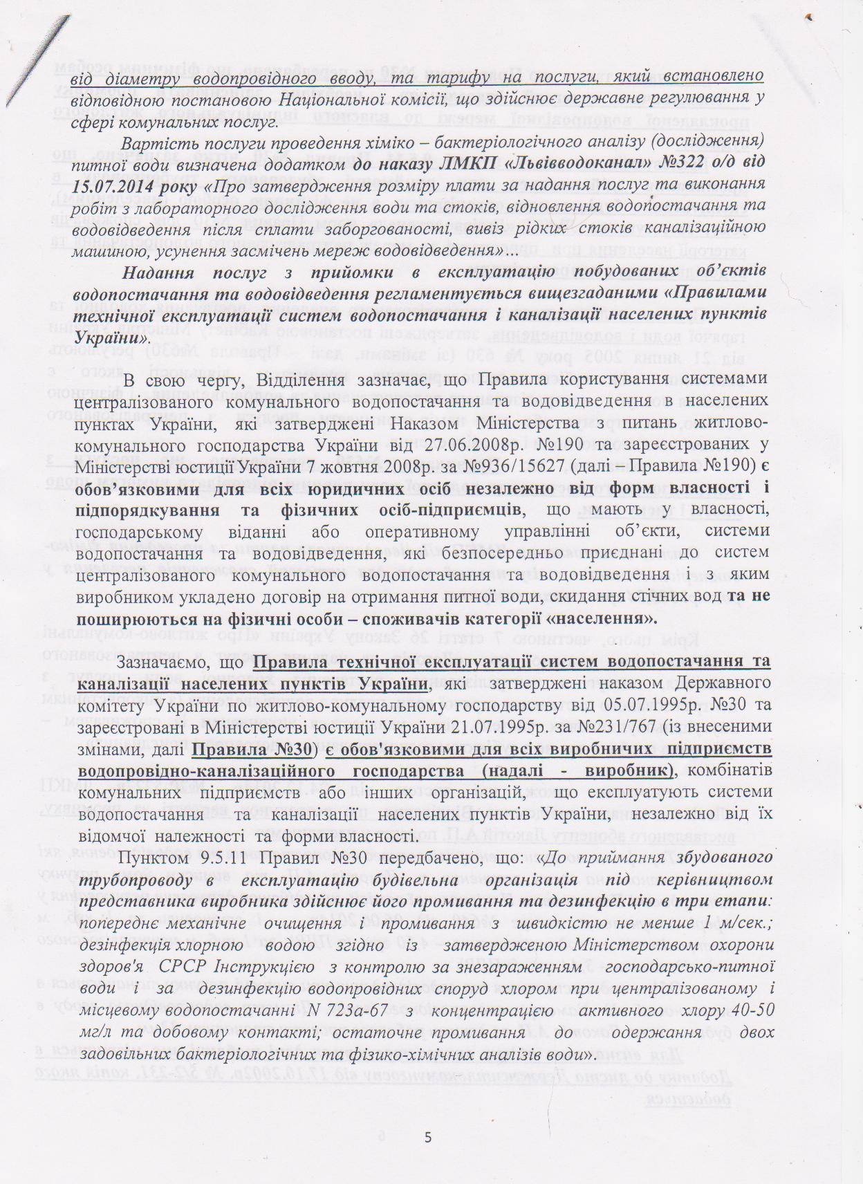 porterlv Опубліковано: 16 жовтня 2014 Автор Поділитись Опубліковано: 16 жовтня 2014 (змінено) Написав офіційний запит в водоканал, чекаю відповіді. Їз запиту має стати зрозуміло, якими саме правовими актами керується водоканал у своїх вимогах. По логіці, вимоги водоканалу десь в астралі, бо не відповідають вимогам Н А К А З N 30 від 05.07.9 "Про затвердження Правил технічної експлуатації систем водопостачання та каналізації населених пунктів України" і перевищують вимоги Н А К А З №190 від 27.06.2008 "Про затвердження Правил користування системами централізованого комунального водопостачання та водовідведення в населених пунктах України ". Судячи з назв наказів, виходить, що перший призначений для самого водоканалу, котрий постачає воду у місто. А другий - саме стосується мене як споживача. Бо, я не постачаю воду у населений пункт а підключаюсь до комунального міського водогону. Логічно? Що думаєте? Хто стикався з подібним і як розрулював??? У якої організації вимагати офіційного роз'яснення норм застосування законів чи наказів по водопостачанню? Писав запити в санепідмку і гірхімпромнагляд - відписались, що не в їх компетенції... * Чи цікаві комусь відповіді водоканалу на запити? Чи публікувати їх? * * * Був раніше у антимонопольному комітеті, консультувався по наведених питаннях. Заяву не писав, бо ще не давав запитів у водоканал на той час. Сьогодні говорив з антимонопольниками, вони уже самі давали запит, із відповіді ясно, що промивка і хімбак аналіз не потрібні. Самої відповіді ще не бачив. Як отримаю на свій запит піду в антимонополку звіряти Також, за словами антимонополки, мої відносини з водоканалом регламентуються не 190-стим, не 30-тим а 630 наказом (від 21 липня 2005р). Іду шукати - читати цей наказ, пізніше відпишусь. * * * Повна назва документу № 630: П О С Т А Н О В А від 21 липня 2005 р. N 630 Київ Про затвердження Правил надання послуг з централізованого опалення, постачання холодної та гарячої води і водовідведення та типового договору про надання послуг з централізованого опалення, постачання холодної та гарячої води і водовідведення Однак, у ньому жодного слова про підключення. Ясно, що нічого не ясно... Змінено 16 жовтня 2014 користувачем porterlv 1 Посилання на коментар Поділитися на інших сайтах More sharing options...