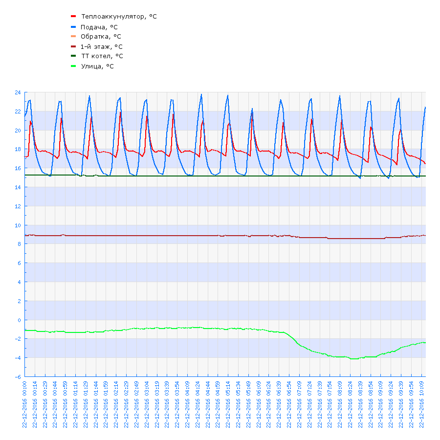 Блуждающий ТВЭЛ Опубліковано: 21 грудня 2016 Автор Поділитись Опубліковано: 21 грудня 2016 (змінено) Ну вот, удаленный мониторинг кардиограммы дома дает пищу для размышлений о дальнейшей настройке системы управления. Возможно, стоит пока отключить один из ТЭНов для уменьшения пиковой нагрузки на автоматы и проводку. Виден заброс тепла в ТА при включении электрокотла т.к. занижена температура открытия обратки. Иначе компенсирующие перетоки пошли бы через бойлер. Из этого следует, что в режиме поддержания остаточное тепло из бойлера может тоже уходить в поддержку отопления. Это вполне приемлемо в случае, если уезжаем на несколько дней и это тепло не нужно. Ну и предстоит утеплить накладные датчики, а то подвирают немного. p.s. Датчик обратки забыл прикрутить датчик второго этажа еще не приехал. Змінено 21 грудня 2016 користувачем Блуждающий ТВЭЛ 1 Посилання на коментар Поділитися на інших сайтах More sharing options...