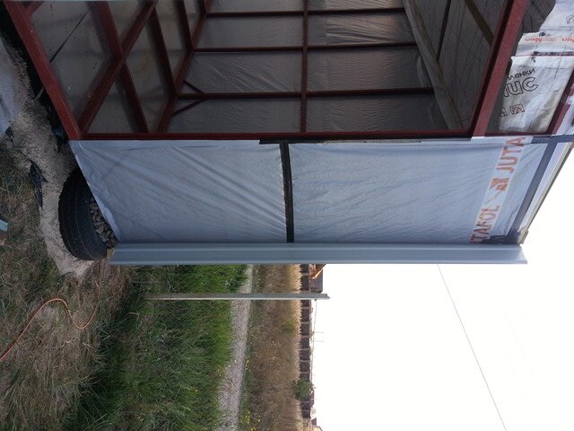 DAlexUA Опубліковано: 6 жовтня 2015 Автор Поділитись Опубліковано: 6 жовтня 2015 После паузы, в течении которой аккумулировал средства на следующий этап - профнастил для стен начал монтаж гидробарьера для стен. Использовал технику и материалы, которые зарекомендовали себя - скотч двусторонний, ремонтная лента. Монтаж начал снизу, верхний слой стыковал с гидробарьером крыши и пускал внахлест на нижний слой. На стенах решил рейку не крепить, думаю, что вентиляции будет достаточно за счет того, что профиль крепится стороной с меньшими пазами. Стыки все проклеил лентой. После всех действий бытовка приобрела форму Внутри даже стало жарковато. Поскольку окошко еще не купил (хотя место для него предусмотрено), то заклеил проем тоже. Потом буду вырезать под окно, которое появится. Ну и тут подвезли профиль для стен Посилання на коментар Поділитися на інших сайтах More sharing options...