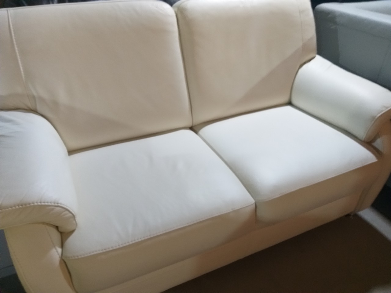 34. Лот 396. Кожаные диваны двухместный и трехместный цвета слоновой кости. Диваны не раскладываются. . Длина трехместного дивана 2.0 м. Длина двухместного 1.7 м. Хромированные ножки, стильный современный дизайн.