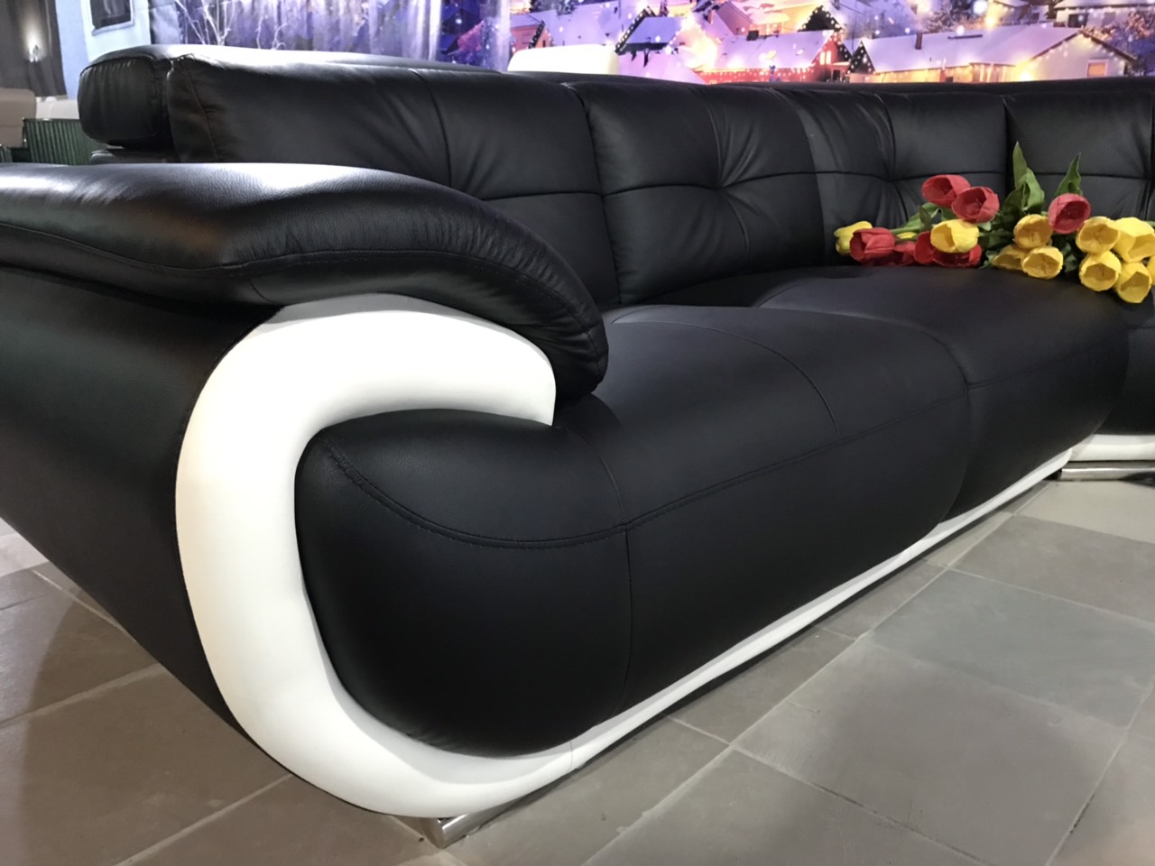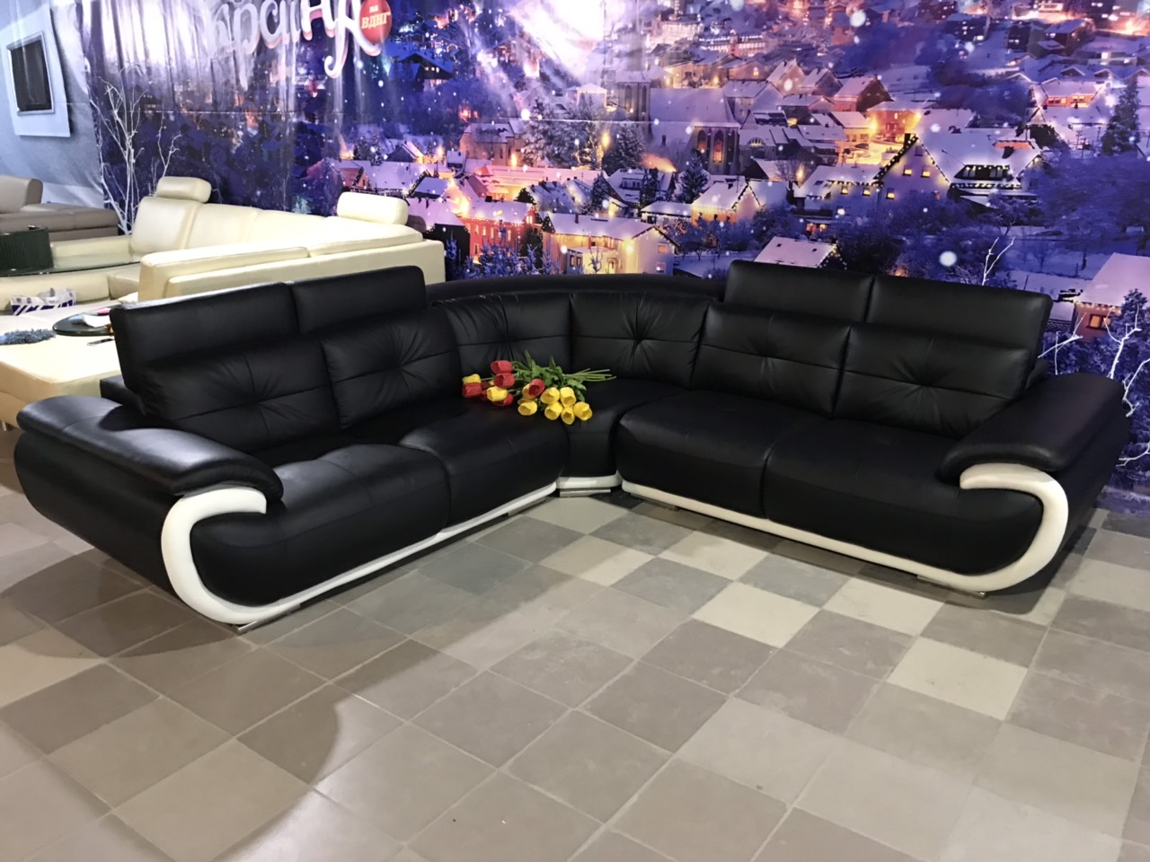 Лот 19. Шикарный кожаный угловой диван. Диван новый, в использовании не был. Красивый стильный дизайн, двойная строчка, мягкая , толстая кожа. Черный диван отделан белоснежным кантом. Стильные хромированные ножки. Современный красивый диван. Размеры 2.75 на 2.75 м.