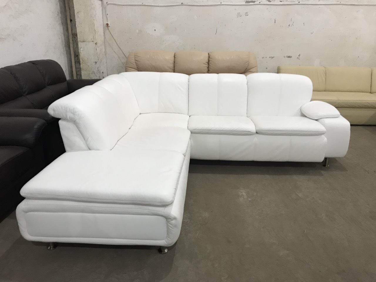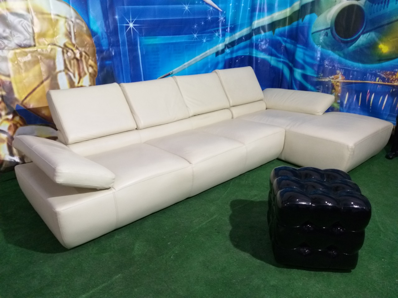 31. Лот 404. Кожаный угловой диван цвета слоновой кости . Подголовники и подлокотники регулируются в 3 положениях. Длина дивана 2.7 м на 2.1 м. Диван не раскладывается. Отличное состояние . Стильный диван из натуральной кожи с хромированными ножками. Производство Германии.
