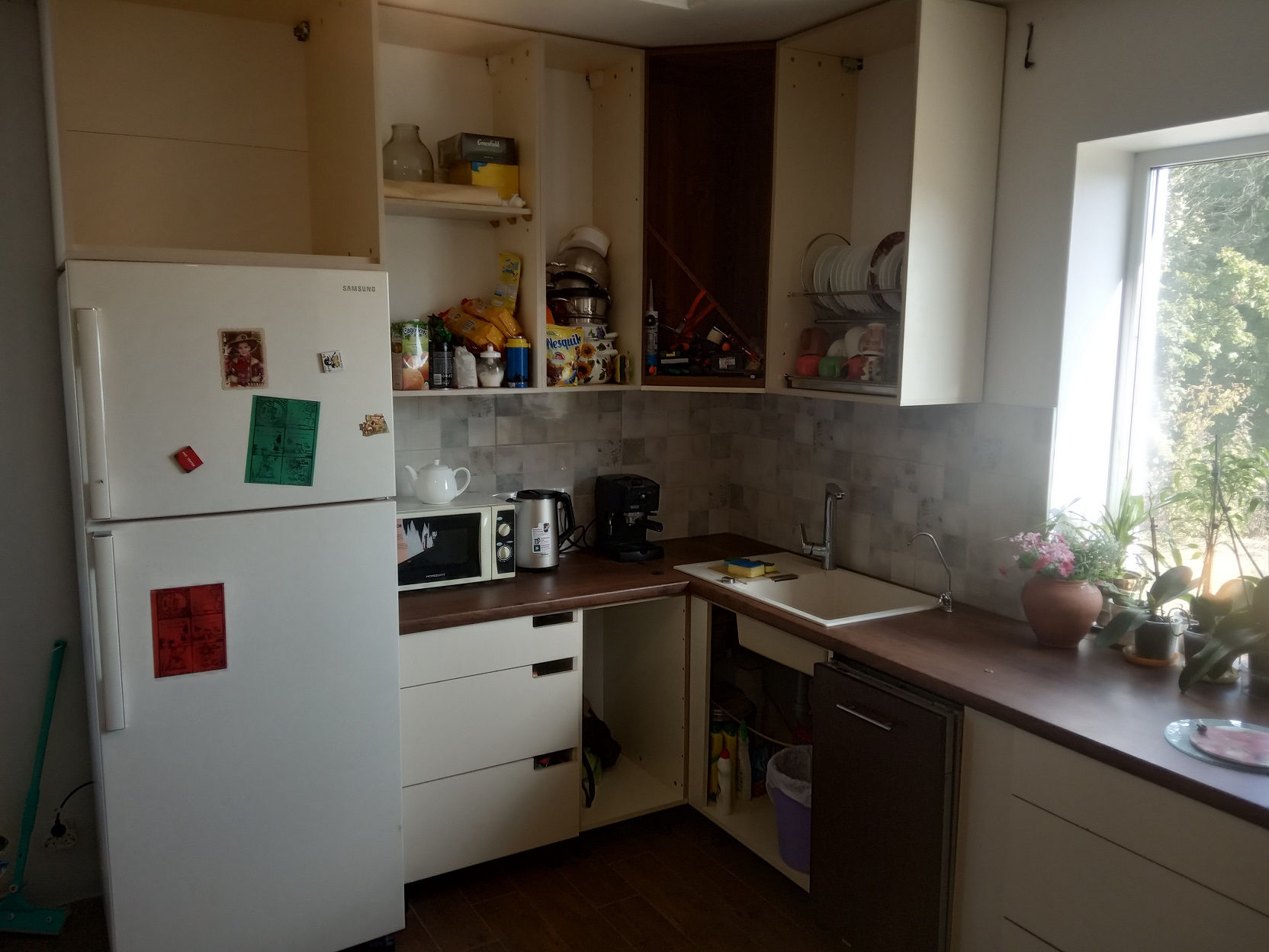 digor_ua Опубліковано: 24 вересня 2019 Автор Поділитись Опубліковано: 24 вересня 2019 Давайте про кухню - чтопочем, можно с фотками. Начал пристреливаться к этой теме, выбор материалов за несколько лет неслабо вырос, кмк. та там все просто я делаю, а жена командует ну по деньгам оно мне вышло пока что где-то так: 10 000 грн напилять ДСП в Даске 5 000 грн на две тумбы с фанеры (этоо под мойку и та, которая левее мойки под картошку, бо там влага и ДСП помрет за неделю) 3500 мойка 8000 грн всякие там болты, стяжки, ящики и прочая мелочевка нету пока что фасадов и ручек. потому что решили что надо сначала сделать кухню, а потом уже фасады покупать на то, что получилось. Честно говоря решение было правильное, ибо в процессе там ящик подрезали, там удлинили, а потом еще и кухню на 20 см возле холодильника укоротили. Ну а пара см туда-сюда этож вобще не в счет, а были бы фасады так это почти все пришлось бы переделывать. А так ДСПшку отпилил, кромку утюгом приклеил и красиво и вытяжку с вентилятором купить надо, все руки не доходят собственно общий вид того, что есть сейчас ну и там дальше в аттачментах из интересного это выдвижные ящики GTV которые по сути тот же Блюм, с доводчиком, с нагрузкой до 50 кг (если верить инструкции), но за вменяемые деньги около 500-600 грн штука тумба под мойкой и левее мойки (под картошку) из фанеры потому что влагостойкая, ибо ДСП в том месте долго не живет (ибо картошка и влага) но при этом две тумбы стоят по материалам как половина отсавшегося корпуса вместе со столешницей осмос сунул под мойку, в ту часть которая в углу, заодно сэкономил на всяких там мэжик корнерах, ибо место занято и жаба не давит что оно там пустует научился клеить стыки столешницы, ну так чтоб совсем почти ничего не видно правда эта срань из ДСП все равно где-то набрала воды и чуть левее окна уже набухла не материал, а декорация какая-то, тьху ну и мойка Франке, с какого-то там тектонайта, последнее достижение науки и техники и все такое от нее двоякое впечатление. в комплекте с мойкой есть все, сифон нормальный, вот та крутилка, чтоб закрывать-открывать воду, площадка под кран человеческая и все такое вот когда прикручиваешь, то сразу чувствуется что людьми для людей сделано а и вот с использованием сюрприз она оказывается грязь впитывает причем достаточно немножко испачкать, чтоб оно впиталось и стандартными средствами для мойки (ну вот крем-гель Clif например) не отмывалось даже если хорошо потереть с привычной нам нержавейкой такой фигни не было похоже какая-то химия для нее надо специальная, или еще что по крайней мере теми средствами, что есть у нас отмыть ее не получается. 7 Посилання на коментар Поділитися на інших сайтах More sharing options...