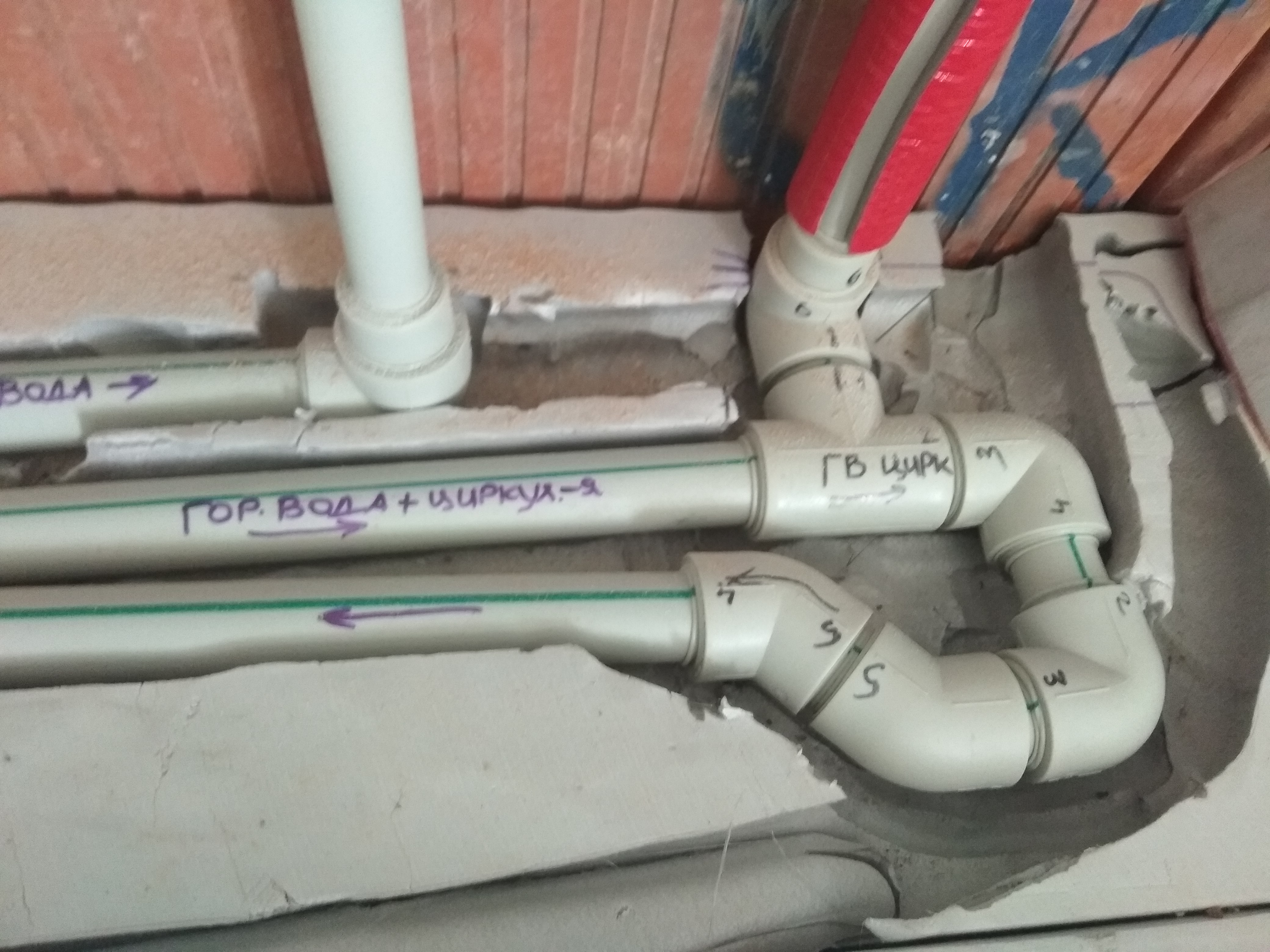 Счастливый Обладатель Опубліковано: 16 квітня 2021 Автор Поділитись Опубліковано: 16 квітня 2021 Затем приступил к пайке труб Г и Х воды. Выбрал горячую трубу с базальтовой армировкой на циркуляцию 25ю(ДУ 18мм), на подводы к разбору 20ю(ДУ 12мм)- лишние потери на гидросопротивление не нужны(это когда кто-то душе, а кто-то горшок смывает... ну, сами понимаете ). Главные магистрали к коллекторам из 32й(ДУ 25, а по факту 22мм). На линию циркуляции ГВ прицепил полотенцесушитель в ванной(летом же не гонять отопление) с байпасом( не нужен ПС, тогда байпас полностью открыт , а вход/выход на ПС закрыты). Закончив с прокладкой магистралей отопления и воды, укрыл их следующим, последним 5см листом утеплителя. Компесация напряжений при тепловом расширении обеспечена свободной канавкой и мягкой трубкой ПЭТ трубкой, понятно, что все линии подачи/обратки в месте подсоединения к коллектору имеют свободный ход до 2-5см для удобства монтажа. Купил и уложил базальтовую сетку с ячейкой 100х100мм ,2мм, 50мп. Трубу креплю к ней хомутами-стяжками. Отдельно о сетке- расматривать ее , как достаточное армирование для плиты ТП не имеет смасла, т.к. рабочая (цельный пруток)сторона расположена соостно бухте, а конструктивная( сплетаюие нити) вдоль мотка (вероятно такова технология плетения), но как-то лучше с ней, чем без нее, к тому же, сетка еще слегка приподнимется и над трубой будет еще один шар. Трубка ТП РИХАУ была закуплена, кажется позапрошлым годом у Muravа- бухта 500м 17х2.Забегая наперед - это верное решение, т.к. замять или повредить при хождении во время заливки металопласт можно " на раз-два". Изначально хотел приготовить размотачный станок, но пришел к выводу, что только время потеряю, отрезал с запасом 50 см( очковал, на экране одно, а в натуре моГет быть по другому. Так и вышло- в ванной лишние 5м, в гостинной на 2м контуре не хватило 3м, пришлось перематывать(день минус), но все же легче , чем крутить 40кг бухту. Теплый пол разбит на на 6 контуров, гребенка установлена в корридоре так, чтобы удобно было регулировать( в пристенном мебельном шкафу). Длины контуров, включая подачу и обратки старался приблизить к одинаковым 45 мп СУ, 48,52,50,49мп гостинная, 50мп корридор. При проягивании сквозь камень можно засорить трубки мусором- поэтому вход/выход закрыл скотчем. Далее будет... 5 Посилання на коментар Поділитися на інших сайтах More sharing options...