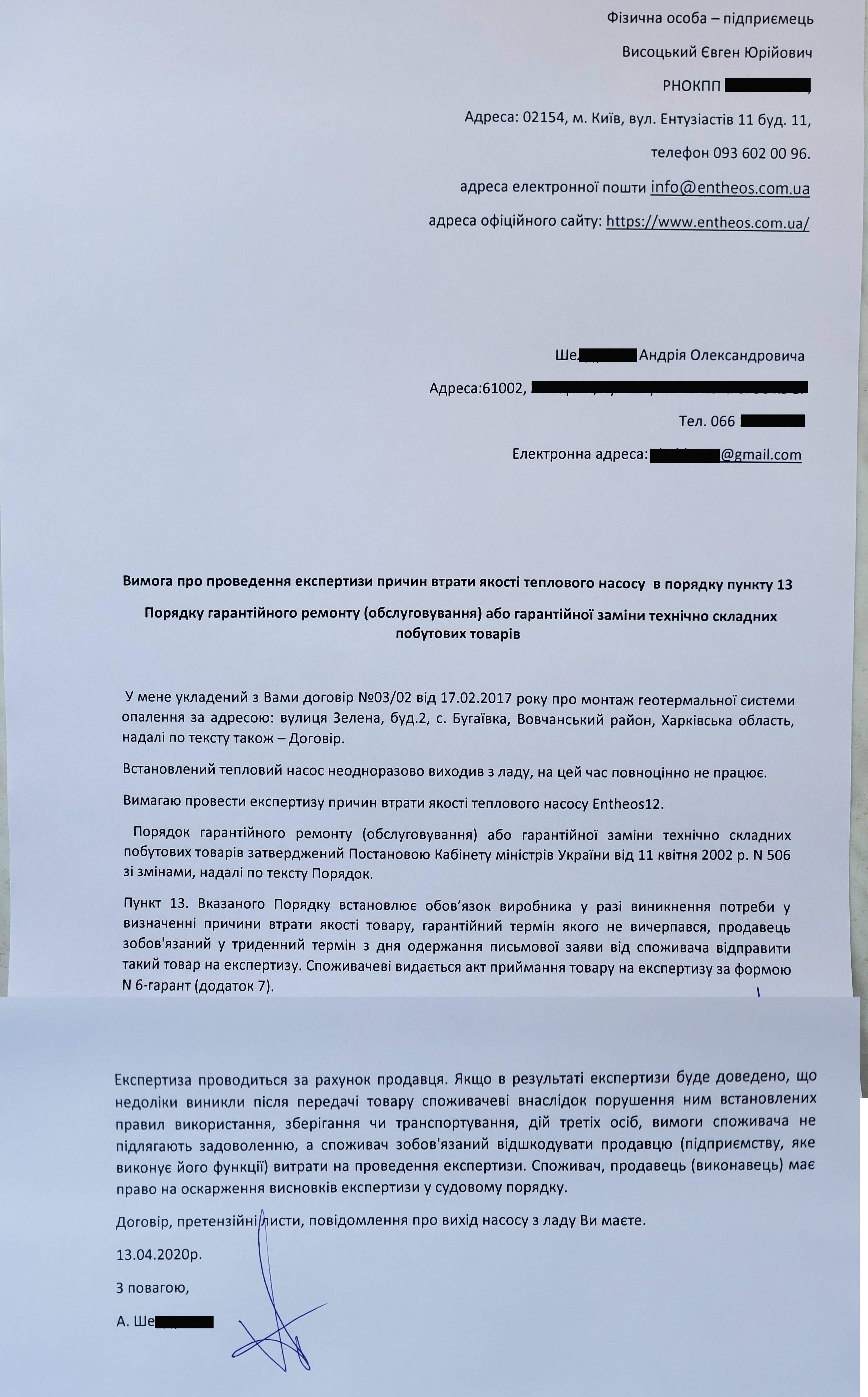МаТраС Опубліковано: 13 квітня 2020 Поділитись Опубліковано: 13 квітня 2020 Фізична особа – підприємець Висоцький Євген Юрійович РНОКПП __________, Адреса: 02154, м. Київ, вул. Ентузіастів 11 буд. 11, телефон 093 _______. адреса електронної пошти info@entheos.com.ua адреса офіційного сайту: www.entheos.com.ua/ ______ Андрія Олександровича Адреса:61002, _________________. Тел. 066 _______ Електронна адреса: ______@gmail.com Вимога про проведення експертизи причин втрати якості теплового насосу в порядку пункту 13 Порядку гарантійного ремонту (обслуговування) або гарантійної заміни H] 3 часть?? Посилання на коментар Поділитися на інших сайтах More sharing options...