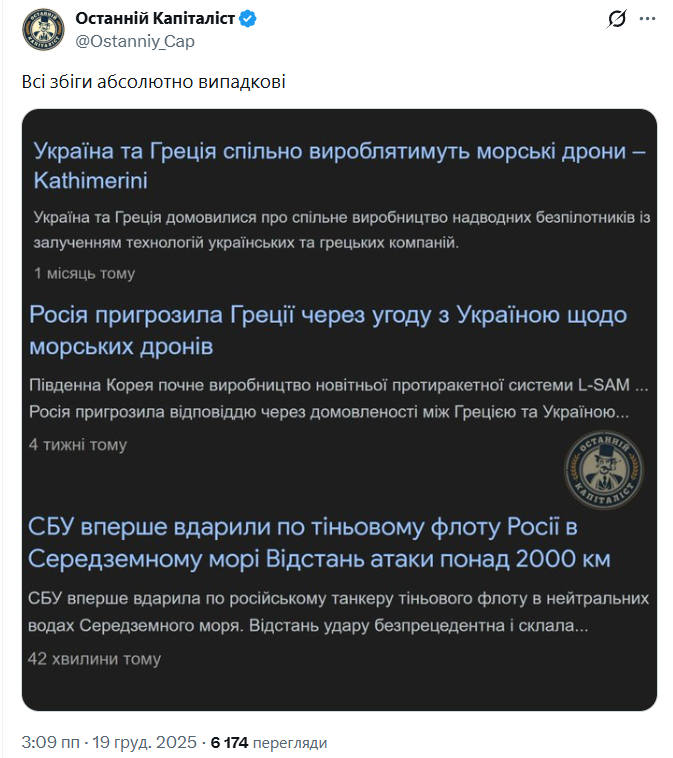 eam Опубліковано: В п'ятницю в 16:38 Поділитись Опубліковано: В п'ятницю в 16:38 (змінено) 14 минут назад, Invest-finans сказал: После трех черноморских танкеров, когда немного дошло что нападение на торговые суда по "морскому праву" считаются актом терроризма немного подчистили и стали осторожней брать на себя ответственность за нападения на гражданские суда. Там, даже, дедушка Эрди ножками топать начал. Причем тут торговые суда если речь шла про подлодку? Ты же сам сказал что именно подлодку уничтожили пару дней назад. 28 минут назад, Invest-finans сказал: Так пару дней назад сообщали что полностью уничтожили вместе с экипажем и кучей генералов. Потом, правда, как то нэвдобно получилось. Лодка вся целая. Попали по пирсу. Может стоит и в этот раз отложить празднование до более правдивой информации? По одному из видео там даже пожар не случился. Что за гнилые попытки съехать с базара Приведи ссылку где СБУ говорило, что уничтожило подлодку. Можно без генералов А то твое сообщение как твой же вымысел выглядит. Змінено В п'ятницю в 16:43 користувачем eam Посилання на коментар Поділитися на інших сайтах More sharing options...