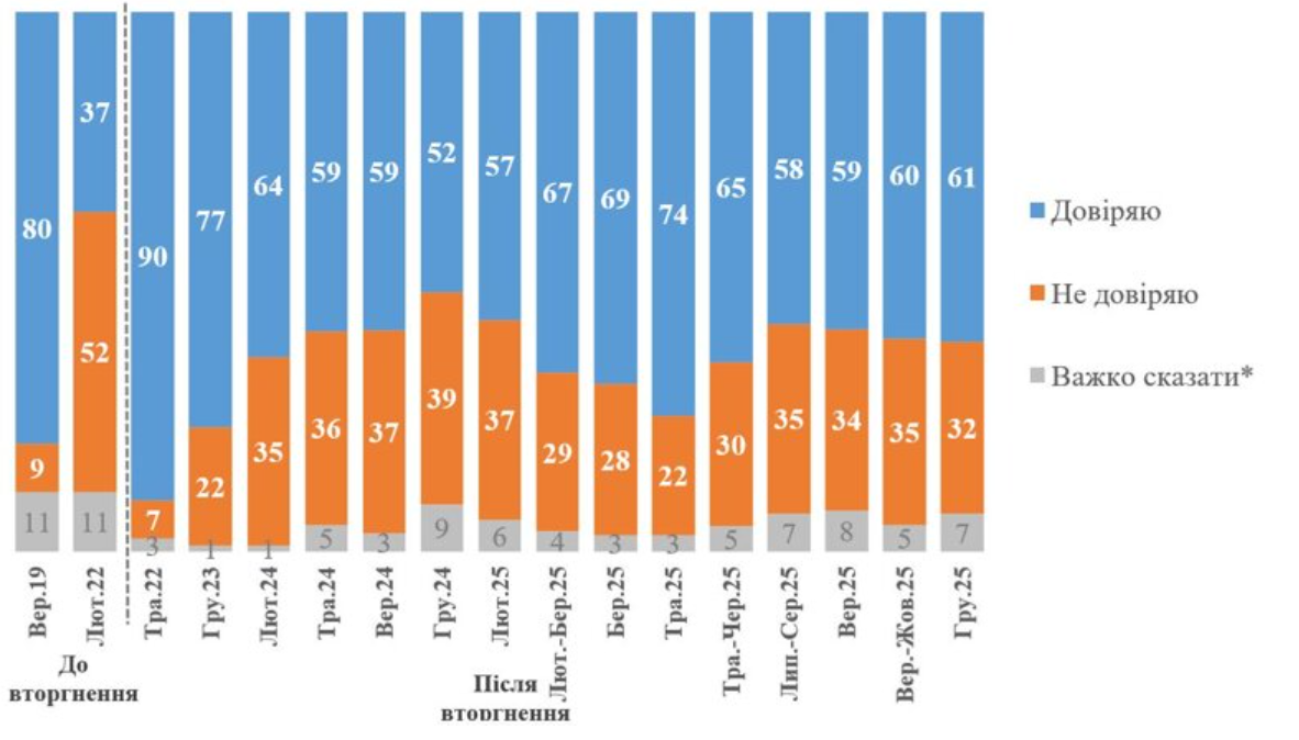 Vinsol2009 Опубліковано: В п'ятницю в 17:57 Поділитись Опубліковано: В п'ятницю в 17:57 8 годин тому, 7351 сказав: Рейтинг доверия к президенту Владимиру Зеленскому среди украинцев восстановился до отметки 61% после снижения осенью на фоне коррупционного скандала. Об этом свидетельствуют данные опроса Киевского международного института социологии (КМИС). Как отмечается, уровень доверия к президенту Владимиру Зеленскому восстановился после колебаний осенью и сейчас составляет 61%. Не доверяют главе государства 32% украинцев, а баланс доверия-недоверия составляет +29%. Как известно, в ноябре (26-30 ноября) Зеленскому доверяли 49% респондентов, в начале декабря (1-13 декабря) этот показатель вырос до 63%, а на прошлой неделе (8-13 декабря) – до 65%. Директор КМИС Антон Грушецкий предполагает, что уровень доверия к Зеленскому снизился после публикации расследования «Мидас» о коррупции в энергетике. «Уровень доверия к Зеленскому после коррупционного скандала скорее всего снизился примерно на 10 процентных пунктов, но после увольнения Андрея Ермака и роста давления со стороны США восстановился до прежнего уровня и составляет 61%», – отметил он. ru.slovoidilo.ua/2025/12/15/novost/politika/rejting-doveriya-zelenskomu-ukraincev-vyros-61-opros Посилання на коментар Поділитися на інших сайтах More sharing options...