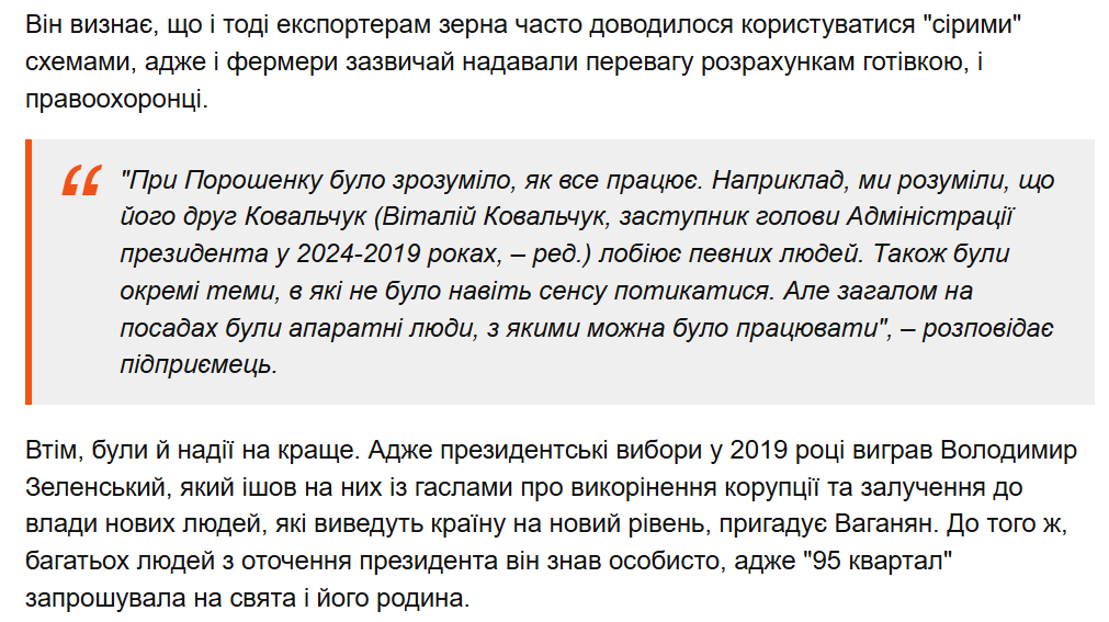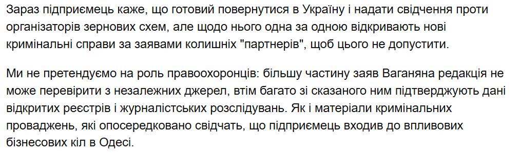 7351 Опубліковано: учора в 11:46 Поділитись Опубліковано: учора в 11:46 7 хвилин тому, Александр Аврамчук сказав: Підприємець Сергій Ваганян: "На зерні працював свій "шлагбаум", я готовий все розповісти НАБУ" Автор: Василь Мельник Операція "Мідас" дозволила українцям зазирнути за ширму телемарафону і побачити, як насправді ухвалюються рішення в країні. І хто їх ухвалює. Майже ні в кого немає сумніву, що оприлюднені НАБУ і САП матеріали про корупційну схему "шлагбаум", яка передбачала вимагання "відкатів" від підрядників "Енергоатому", – лише частина загальної картини. Схожі схеми працювали і в інших сферах, зокрема – на ринку зерна, стверджує підприємець Сергій Ваганян. За його словами, у цьому випадку вона працювала під прикриттям ще одного вихідця з "Кварталу 95" – колишнього голови СБУ Івана Баканова та його "правої руки" Андрія Наумова. Джерело: https://censor.net/r3593805 З посилання: Тобто, людина торгується -- очікує, хто запропонує кращі умови, щоб цій людині відпетляти від крімінальної відповідальності: 1 Посилання на коментар Поділитися на інших сайтах More sharing options...