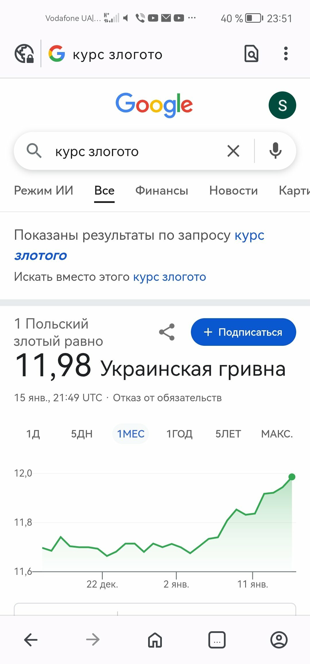 Дощ Опубліковано: 4 хвилини тому Поділитись Опубліковано: 4 хвилини тому 1 година тому, sergio сказав: Ще не зовсім. А були часи, що гривня була дорожче злотого. Коли поляки міняли старі злоті на нові 95 го року, курс був 2, 33 зл до бакса, а коли наступного рокуп впроважували гривню, в нас курс був 1, 84 за бакс Кажуть вологодца у Львові можна упізнати не за парашутом, а за мовою телефона чи комп'ютера Посилання на коментар Поділитися на інших сайтах More sharing options...