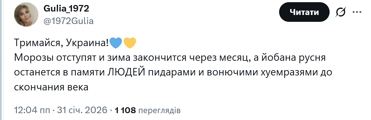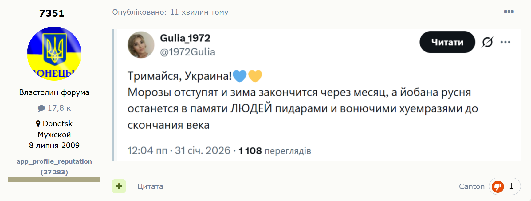 karbo Опубліковано: 1 година тому Поділитись Опубліковано: 1 година тому 3 хвилини тому, sat-prof сказав: Насправді за так званою "загальноросійською ідеєю" стоїть бажання шовіністичних росіян русифікувати українців і перетворити їх на таких самих росіян, що проживають у Росії. Для росіян українська мова є чужою, вони історично всіляко її пригнічували і забороняли. Як свідчать останні історичні події, пов’язані з анексією Криму та війною на Донбасі, росіяни у переважній більшості вороже налаштовані до українців. Вони разом зі своєю "загальноросійською ідеєю" розглядають українців виключно як витратний матеріал, який можна русифікувати і перетворити на таких самих росіян, що проживають у Росії. З тих самих причин не можна вважати росіян і українців ні братніми, ні дружніми народами. Очевидно, що ні друг, ні брат не будуть відбирати територію у свого друга чи брата і розв’язувати війну проти свого друга чи брата. Адже ідеологічно анексія Криму і війна на Донбасі базувалися на ненависті до України та українців. Так звані "гопольченці Донбасу" взяли зброю до рук через те, що, як вони самі висловлюються, їх у складі України змушуватимуть говорити українською мовою. В окупованому Донбасі навчання в школах ведеться виключно російською мовою, хоча в окупованому Донбасі проживає приблизно половина українців. Усі дискурси росіян про один єдиний народ з українцями та їх одночасну ненависть до українців пояснюються двозначністю (двомислістю — російською), коли росіяни мають у голові дві протилежні за змістом думки. Навіть можна сказати, що для росіян характерне багатомислення, коли в них у голові багато різних, протилежних думок. Їхні російські слова про один єдиний народ — це лише їхні порожні російські слова. Насправді вони розглядають українців саме як матеріал, який можна перетворити на таких самих росіян, що населяють Росію. Якби вони щиро вважали українців із собою одним, єдиним народом, тоді не було б війни, вони б не вбивали, калічили українців і не руйнували українські міста. Якби вони щиро вважали українців із собою одним, єдиним народом, вони б самі вивчали українську мову і користувалися нею. У кращому разі вони її ігнорують. А дуже часто вони забороняють і знищують українську мову, тому що розуміють, що вона для них чужа, вона заважає їм перетворити, тобто русифікувати українців у таких самих росіян, що населяють Росію. Українська мова — це українська мова, а друга частина, яка називає себе росіянами, мала б також вивчати і користуватися українською мовою. Але ми спостерігаємо зовсім протилежне, що підтверджує брехливість і фальшивість їхнього тезису про один єдиний народ. Фактично росіяни своїми діями доводять, що їхнє твердження "росіяни і українці — один єдиний народ" є міфом, за яким ховається їхнє бажання русифікувати українців, тобто перетворити їх у таких самих росіян, що населяють Росію. Це все стосується не всіх, а переважної більшості росіян. Хрень якась, що таке росіяни? Про який народ такий йдеться? Не існує росіянського народу згідно закону, та навіть у філології такого поняття нема. Посилання на коментар Поділитися на інших сайтах More sharing options...
