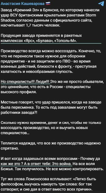 Бездомный Опубліковано: 1 година тому Поділитись Опубліковано: 1 година тому (змінено) генеральний директор "Кремний Эл". Мы ведь сегодня вторые в России по объему среди предприятий микроэлектроники. Надо понимать, если мы сегодня нечаянно исчезнем, то целый ряд военных изделий прекратят свое существование а саме - С 300/400/500 , Іскандер , Калібр , Х 59 , Ярс , Булава та Тополь М ( Орєшник ), винищувачи Су та Міг Змінено 1 година тому користувачем Бездомный Посилання на коментар Поділитися на інших сайтах More sharing options...