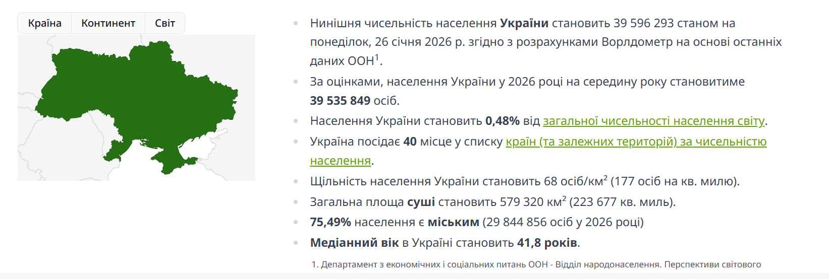 7351 Опубліковано: 39 хвилин тому Поділитись Опубліковано: 39 хвилин тому (змінено) 9 хвилин тому, karbo сказав: Та не питання Скільки населення в Україні на твій погляд? Є офіційна статистика? -- викладай. А поки, те що є: www.worldometers.info/uk/населення-світу/населення-україна/ Змінено 38 хвилин тому користувачем 7351 Посилання на коментар Поділитися на інших сайтах More sharing options...