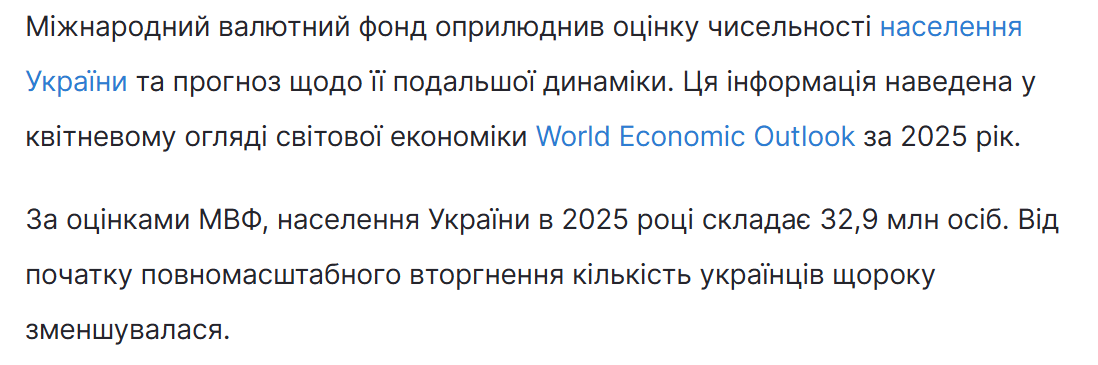 7351 Опубліковано: 23 хвилини тому Поділитись Опубліковано: 23 хвилини тому 6 хвилин тому, karbo сказав: Тобто, до війни було 30 а тепер 28. Ну нормально)) www.unian.ua/economics/other/naselennya-ukrajini-mvf-ociniv-skilki-lyudey-prozhivaye-v-krajini-12989370.html Звизди далі. Посилання на коментар Поділитися на інших сайтах More sharing options...