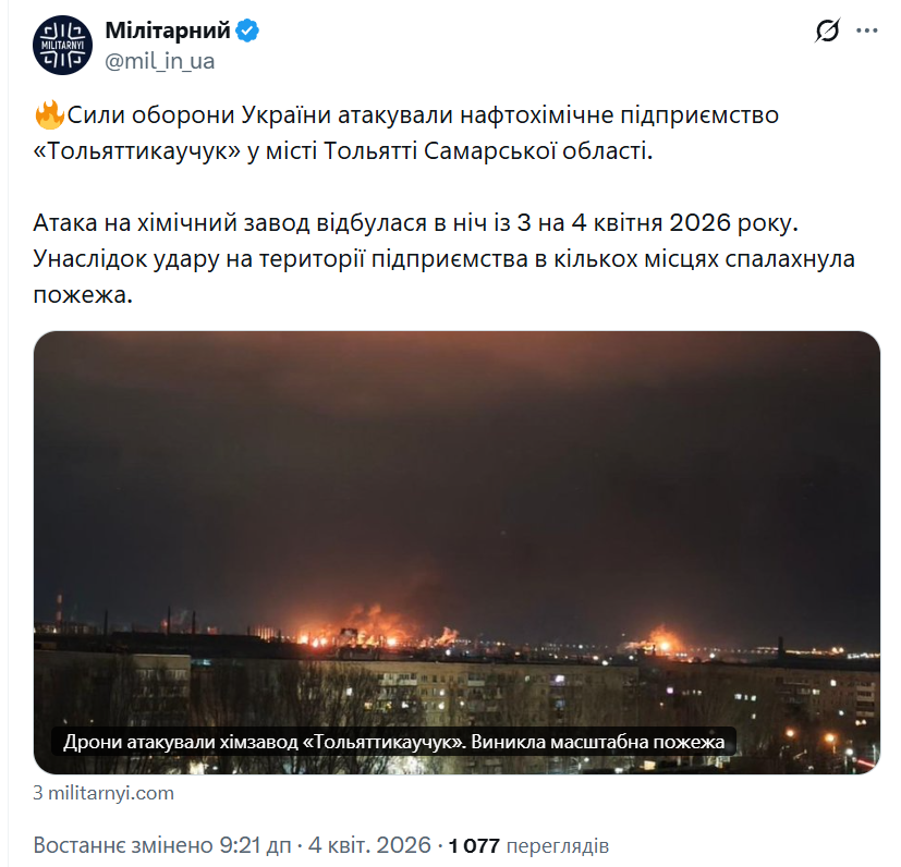 7351 Опубліковано: 1 година тому Поділитись Опубліковано: 1 година тому Сили оборони уразили 5 стратегічних заводів і 10 обʼєктів нафтопереробки у березні. mod.gov.ua/news/pekelni-udari-po-rosiyi-sili-oboroni-urazili-5-strategichnih-zavodiv-i-10-ob-yektiv-naftopererobki-u-berezni 1 Посилання на коментар Поділитися на інших сайтах More sharing options...