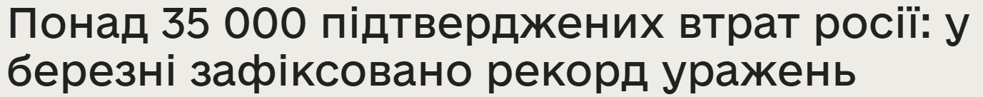 7351 Опубліковано: 1 година тому Поділитись Опубліковано: 1 година тому Понад 35 тисяч росіян було вбито або важко поранено за місяць. Результати зафіксовані в системі єБалів, які нараховуються за верифіковані ураження. Кожне таке ураження підтверджується відео. Переважна більшість втрат противника забезпечена безпілотними системами. Зокрема: 33 988 уражень – БпЛА; 1 363 – артилерія. Серед інших важливих результатів у березні: – 274 систем протиповітряної оборони противника. – 121 систем РСЗВ; – 212 гармат та САУ. У березні кількість Shahed і «Гербер», знищених дронами-перехоплювачами, зросла вдвічі. Було перехоплено 33 686 ворожих БпЛА різних видів. Усього протягом березня воїнами було уражено 151 207 цілей. mod.gov.ua/news/ponad-35-000-pidtverdzhenih-vtrat-rosiyi-u-berezni-zafiksovano-rekord-urazhen-1 1 Посилання на коментар Поділитися на інших сайтах More sharing options...