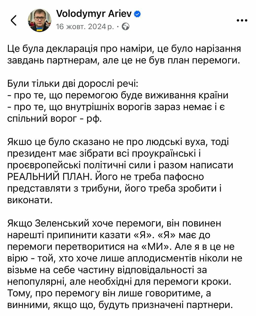 Canton Опубліковано: 2 години тому Поділитись Опубліковано: 2 години тому 2 часа назад, Александр Аврамчук сказал: Річниця потужного представлення "Плану Перемоги". Пам’ятаєте такий? Якось ми пропустили той факт, що на цьому тижні був рік від потужного представлення "Плану Перемоги")) Памʼятаєте такий? Там ще були три таємні додатки, потім був План стійкості (в народі план ChatGPT) через місяць і десь здається План незламності…. Цікаво, а хтось про ці ще плани памʼятає? Джерело: https://censor.net/ua/b3580395 Рік тому президент урочисто, пафосно і з бурними-продолжитєльними представив Верховній Раді те, що назвав планом перемоги. Рупори ОП захлинались від патоки на адресу керівництва і вихваляли його з ніг до голови. Рік тому ми з колегами-однодумцями сказали, що це профанація і отримали, як завжди, купу бруду від рупорів ОП. Що треба було робити заради інтересів України, я написав. Що було зроблено насправді? Немає сенсу переказувати список дурості-2025. Тепер ви самі можете зробити висновки хто був правий. Час все розставляє на місця.(С) 2 1 Посилання на коментар Поділитися на інших сайтах More sharing options...