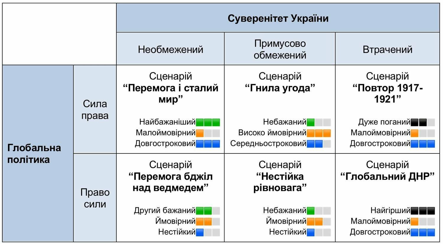 Danylo Ivanov Опубліковано: 1 година тому Поділитись Опубліковано: 1 година тому (змінено) Щоб читати новини, не зачаровуючись і не розчаровуючись, варто знати систему координат, в якій відбуваються поточні події. Наша система координат на малюнку. З цього випливає, що у нас лише два ймовірних сценарії — «Перемога бджіл над ведмедем» та «Гнила угода». Давайте розберемося (детальний аналіз всіх сценаріїв - site.ua/valerii.pekar/scenariyi-zaversennya-viini-pidsumki-forsaitu-iyooon8 ). Сценарій «Перемога і сталий мир» малоймовірний і залежить не від нас: щоб він реалізувався, потрібно, аби США кардинально поміняли свою політику й поновили свої зобов'язання стосовно Європи. Цього не варто очікувати, бо американська політика загалом сформована довгими трендами (посилання у другому коментарі), так само як і американська політика щодо росії (посилання у третьому коментарі). Аналогічно, малоймовірним є сценарій «Глобальний ДНР». Для цього треба, щоб росії вдалося або кардинально прорвати фронт, або радикально розколоти українське суспільство, врешті захопивши Київ та посадивши тут Медведчука чи Януковича. Підстав для захоплення Києва на даний момент не передбачається жодних. Так само нереальним є сценарій «Повтор 1917-1921», самовбивчий для Європи: заплатити українським суверенітетом, щоб росія не чіпала Європу. Я не кажу «дурних нема», бо вони є, але їх невпливова меншість. Отже, в нас лише три ймовірних сценарії. А насправді два, бо «Нестійка рівновага» аж надто нестійка та швидко переходить або ліворуч, або праворуч, або вгору. («Нестійка рівновага» — це підписання угоди в умовах, коли жодна угода нічого не варта й її ніхто не збирається виконувати, тож це ненадовго.) Тепер давайте розберемося з двома ймовірними сценаріями. Нагадаю: Бджоли перемагають ведмедя попри байдужість США за рахунок трьох факторів: українська інноваційність і стійкість, європейська коаліція рішучих, слабкість російської економіки. Всі передумови є, але щоб втілити цей сценарій, нам потрібні термінові суттєві зміни в усіх сферах життя: в управління Силами оборони, в економіці, в державній службі тощо. Маємо всі шанси стати вуликом бджіл (тому цей сценарій залишається ймовірним), але я не бачу в політичних еліт особливого настрою щось змінювати. Тож залишається найбільш імовірний сценарій «Гнила угода». Він є інерційним сценарієм, тобто таким, що втілюється інерційним ходом, самотоком, в умовах, коли всі ключові гравці роблять все те саме, що й завжди. Тут важливим фактором є умови Гнилої угоди: чи вона включає неприйнятні для України речі, як-от офіційне визнання окупованих територій російськими, обмеження Сил оборони, повернення в Україну російської агентури тощо, а чи просто маємо заморожений конфлікт без неприйнятних умов. Ми мусимо наполягати на м’якій угоді й відкидати умови жорсткої (кажуть, саме це сталося під час останньої українсько-американської зустрічі). Ось такий сценарний простір, тож не варто зачаровуватися словами Трампа, щоб потім розчаровуватися черговий раз (здається, вже восьмий?). США не стануть друзями України, принаймні в цьому політичному циклі (а скоріш за все, й у наступному, під час президентства Дж Д Венса), бо Україна заважає США реалізувати дві головні стратегічні цілі — зберегти росію від колапсу, щоб її не забрав Китай, та послабити Європу. Так само США не стануть і ворог