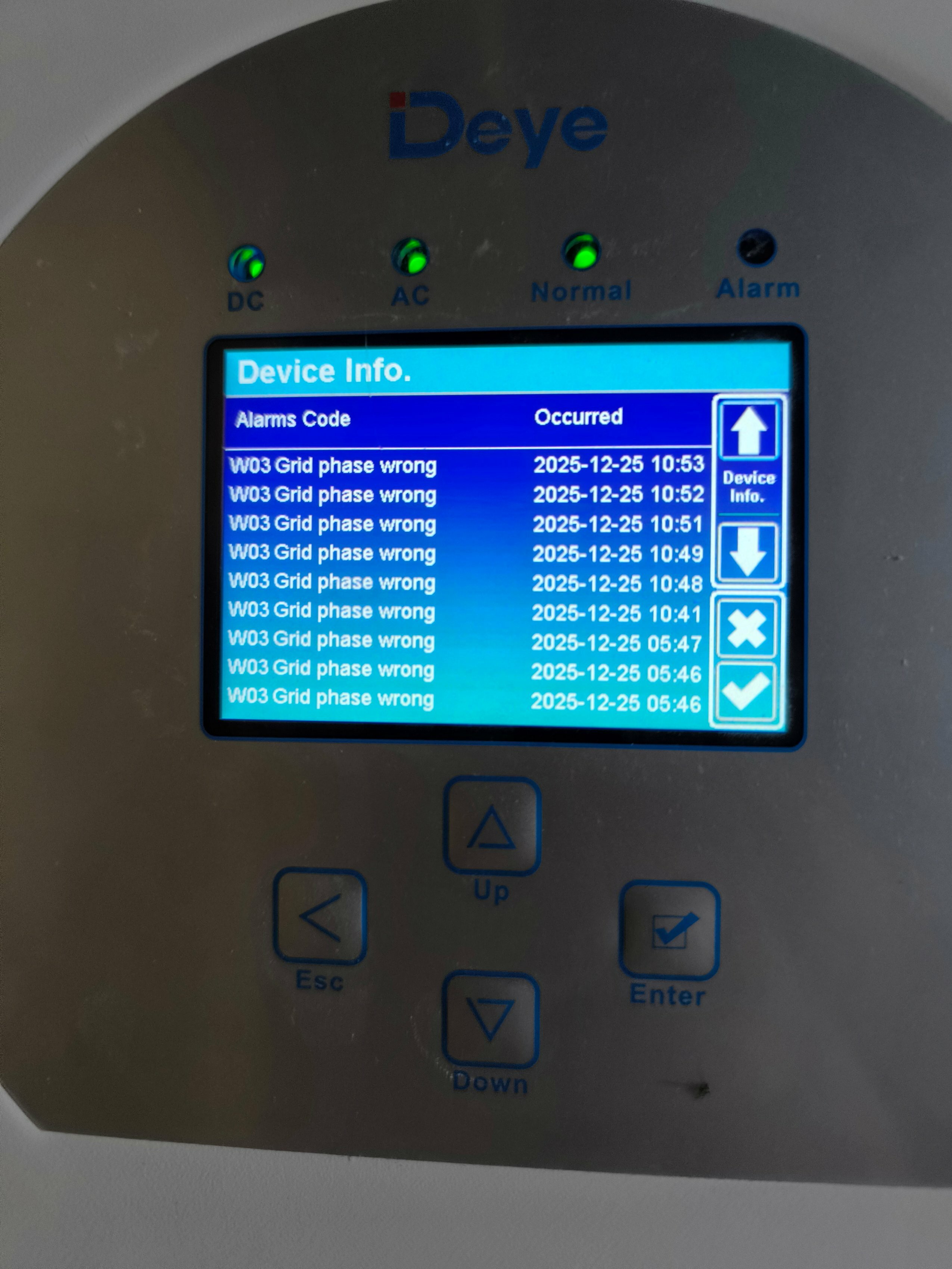 Бармалей Опубліковано: 2 години тому Поділитись Опубліковано: 2 години тому (змінено) 7 минут назад, DimaF сказал: Вот и настал бабушка Юрьев день......🥶 После вчерашнего обстрела, сидели без света 13 часов, и когда дали, то вылезла ошибка W3 (неправильная фаза сети), и не идет зарядка батарей. В конторе которая ставила СЄС, сказали что энергосети включают как могут, и х.з. что делать.... Ошибка W3 (или W03) чаще всего встречается в инверторах Deye и означает несоответствие фаз сети (Grid Phase Wrong), что мешает инвертору работать; решается изменением параметров фаз в настройках инвертора (например, с 0-240-120 на 0-120-240) - что гугл пишет В инверторах Deye: Причина: Неправильное определение фаз переменного тока. Инвертор не может синхронизироваться с сетью. Решение: Зайти в настройки инвертора (через приложение или дисплей) и изменить параметры фаз (например, в меню GD Set), как показано в видео. youtu.be/DFvUBmm8BVw Змінено 2 години тому користувачем Бармалей 1 Посилання на коментар Поділитися на інших сайтах More sharing options...