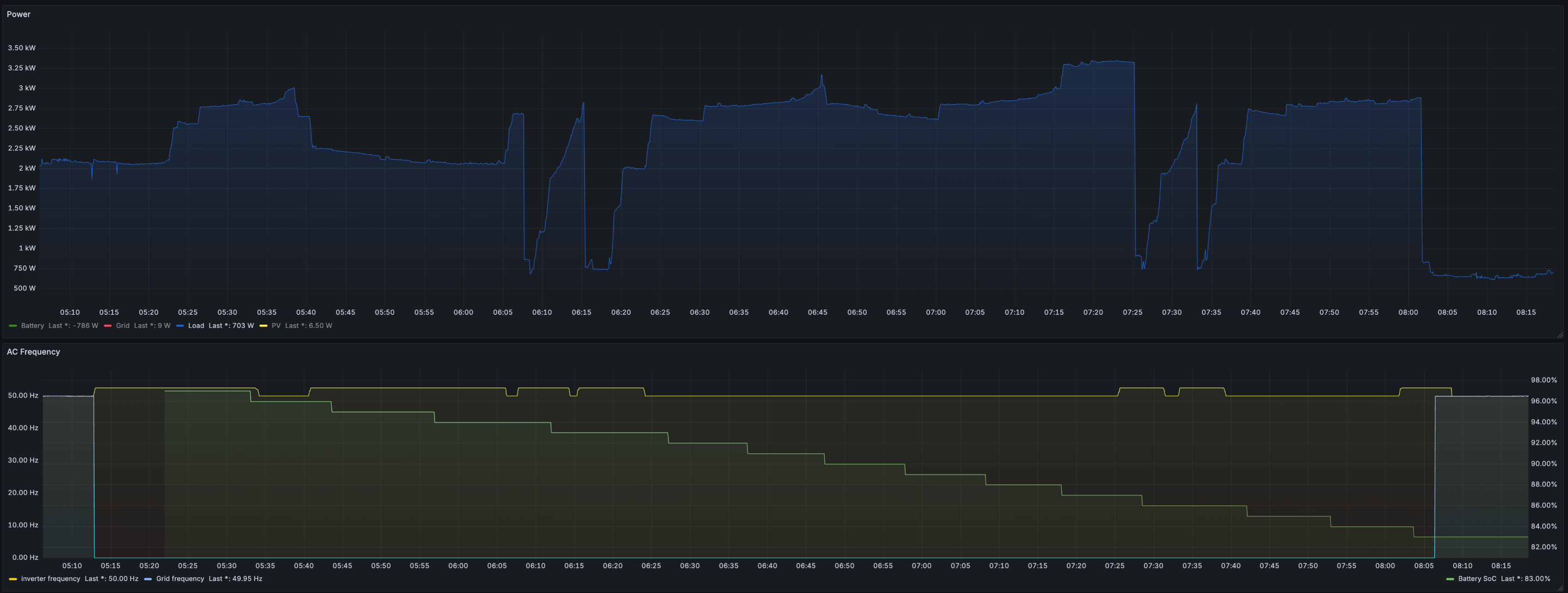 volomoto Опубліковано: 33 хвилини тому Поділитись Опубліковано: 33 хвилини тому Зловив цікавий глюк чи то фічу 2ф гібрида Деє, до якого на Ген порт підключені мікроінвертори. Коли нема мережі, то гібрид керує потужність мікроінверторів шляхом зміни частоти і макс. значення можна задати в налаштуваннях: В мене зараз 50.5, хоча раніше було 52.5, але про це пізніше. Ситуація виглядає так, що частота залежить і від SoC, і від потужності навантаження, але ця залежність мені не є явною, просто кореляція чітко прослідковується: Буду далі досліджувати, бо дуже не хочеться втрачати генерацію під час відключень мережі. 1 Посилання на коментар Поділитися на інших сайтах More sharing options...