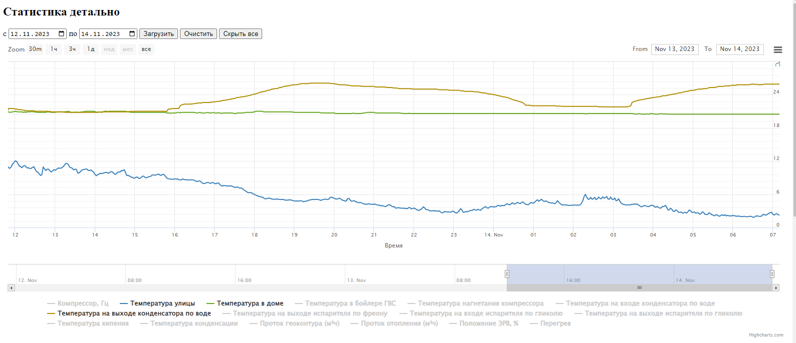 Геоконтур в мене слабенький, але 4,6 кВт вночі я отримав, при температурі в землю 0С. ЦН стоять на середньому положенні, якщо поставити максимум - буде ще трохи потужності.