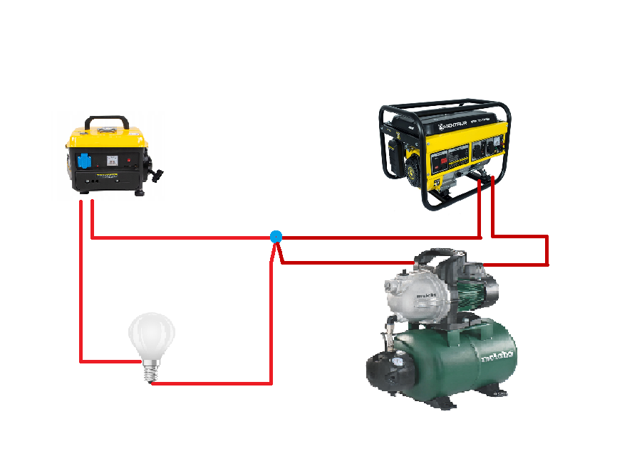 Є приватний будинок з трифазною мережею. При відключенні міської мережі чи існує можливість підключення двох генераторів різної потужності на дві фази з трьох не розриваючи спільного нуля в існуючій проводці будинку? Малюнок для наглядності. Адже в цих двох генераторах один з виходів буде спільним. Навантаження на ці генератори теж буде різне.