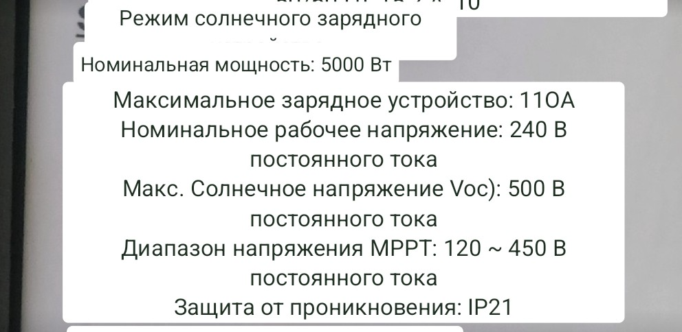 barek Опубліковано: 2 години тому Поділитись Опубліковано: 2 години тому Здравствуйте!!! Гибридный солнечный инвертор Mr Pow. Задумался подключить солнечные панели, ранее не сталкивался с этим, совсем Вот строка 500ватт. Это значит суммарная мощность панелей не может быть выше, это понятно. Пишут ещё, что зимой мощность может расти на панелях и поэтому нужно учитывать +20% Максимальный ток 110А. Это значит суммарный ток панелей не более этого показателя Это понятно А вот номинальное напряжение 240VDC, Макс солнечное напряжение 500VDC и MPPT напр 120-450 VDC, я не понимаю. Можете объяснить пожалуйста, что это и как это учитывать при подборе панелей Благодарю!!! Посилання на коментар Поділитися на інших сайтах More sharing options...