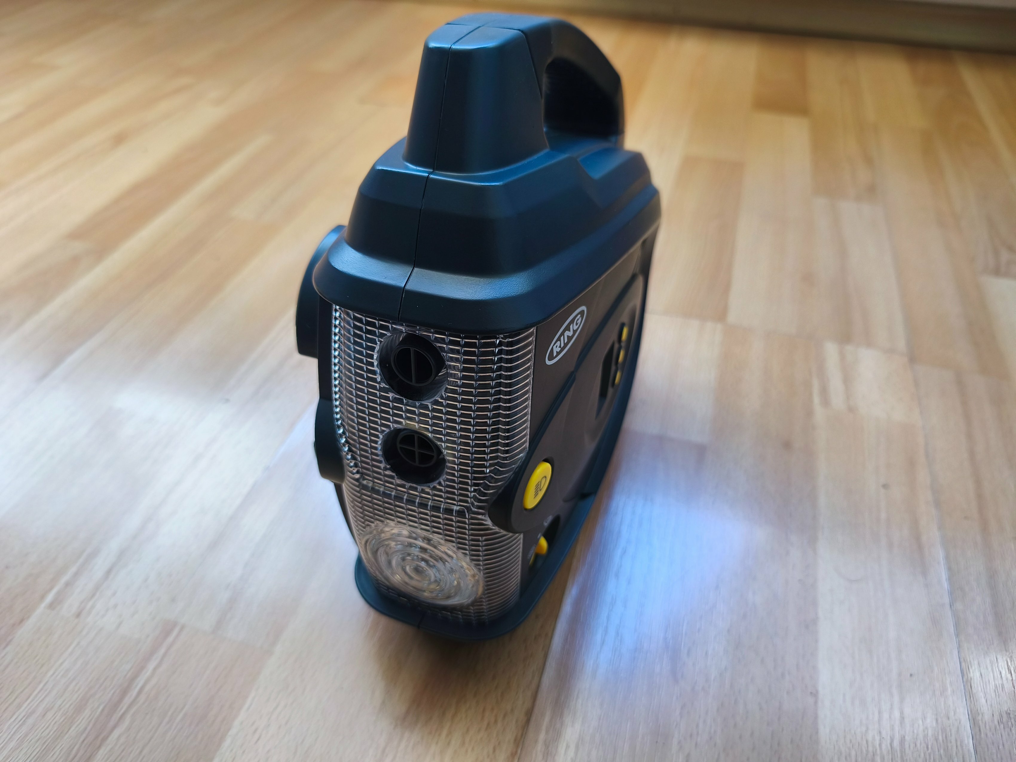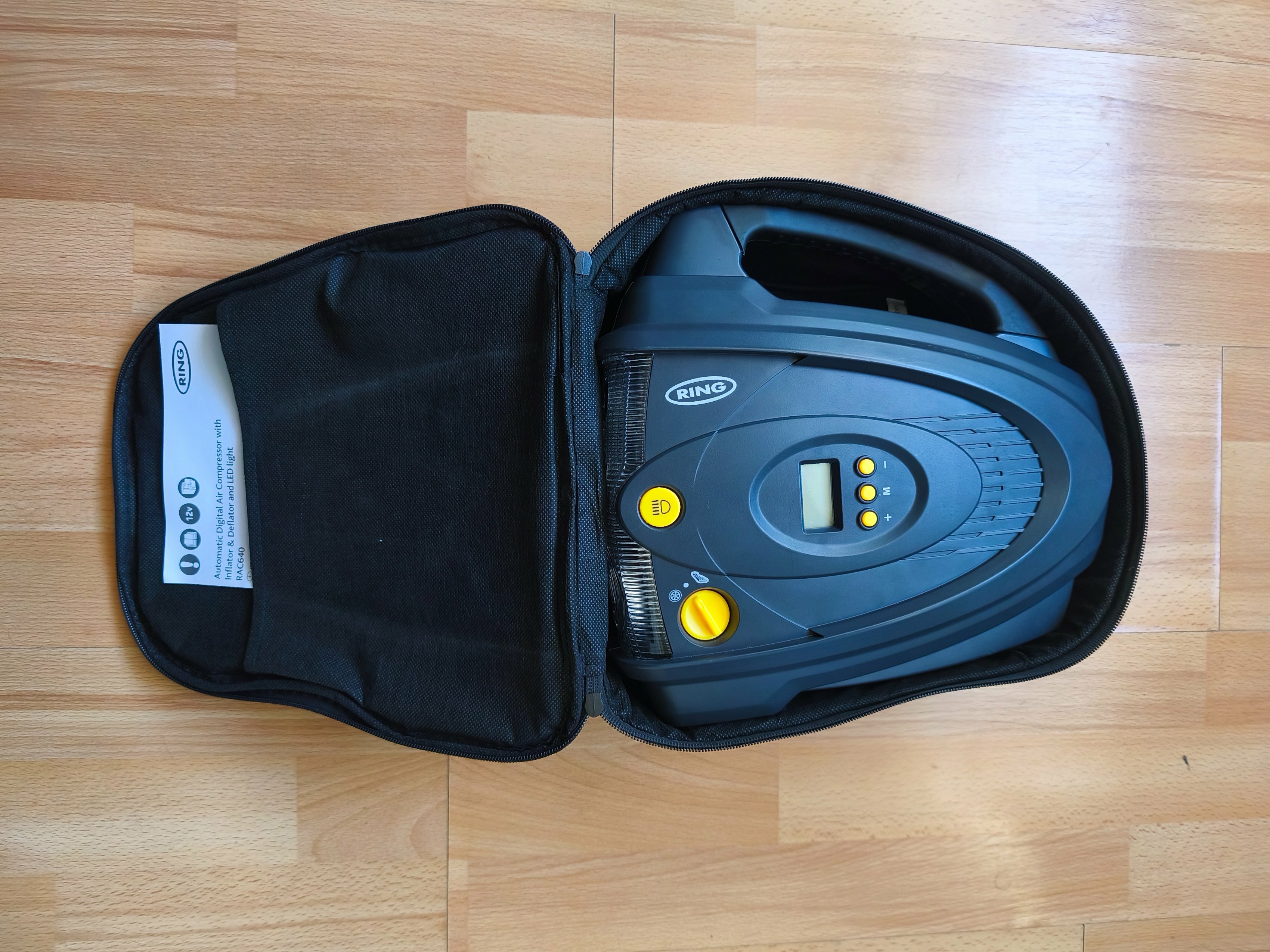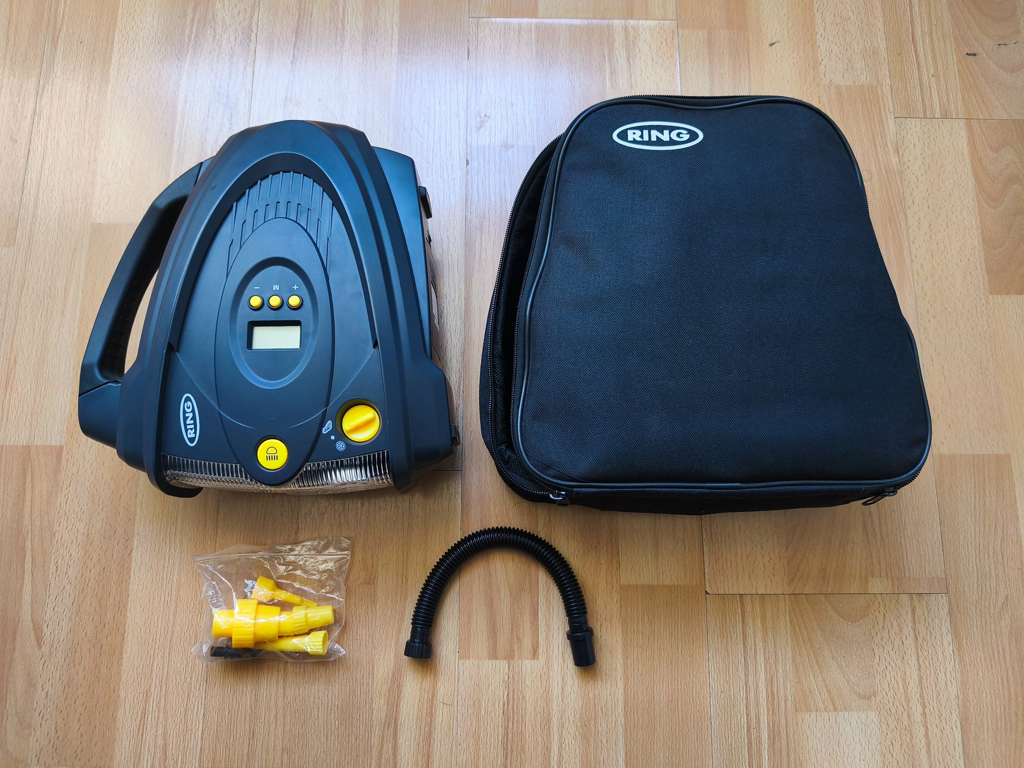 Автомобильный двухмоторный компрессор с LED-фонарем и цифровым датчиком давления от Ring.