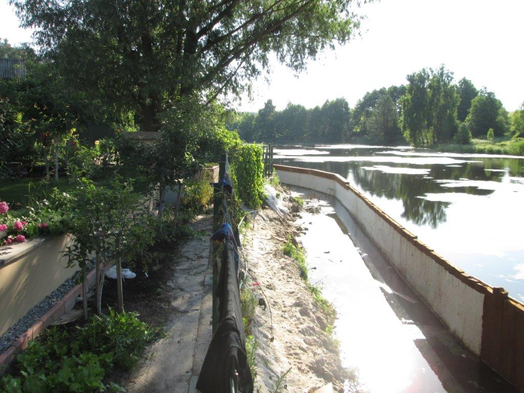Растет и ширится моя китайская стена :) Начали делать "полку" - горизонтальный брус по верху, на который потом переместим сетчатый забор. Вид вдоль берега и с огорода, уже примерно понятно, насколько и как увеличится площадь огорода и нижней террассы. В плане еще 2 кладки, между ними будет расстояние примерно 10-15м. Думаем теперь, как организовать там купально-рыболовную зону. Есть идея между кладками натянуть вертикально сетку и внутрь этой "заводи" запустить толстолоба, сомика итд, чтобы хотя бы эта часть очищалась от ряски и травы. Только по поводу сетки пока не придумали, какую - то ли банальную "рабицу", то ли искать нечто мягкое, и растягивать по принципу рыболовной, сверху поплавки, снизу груз.