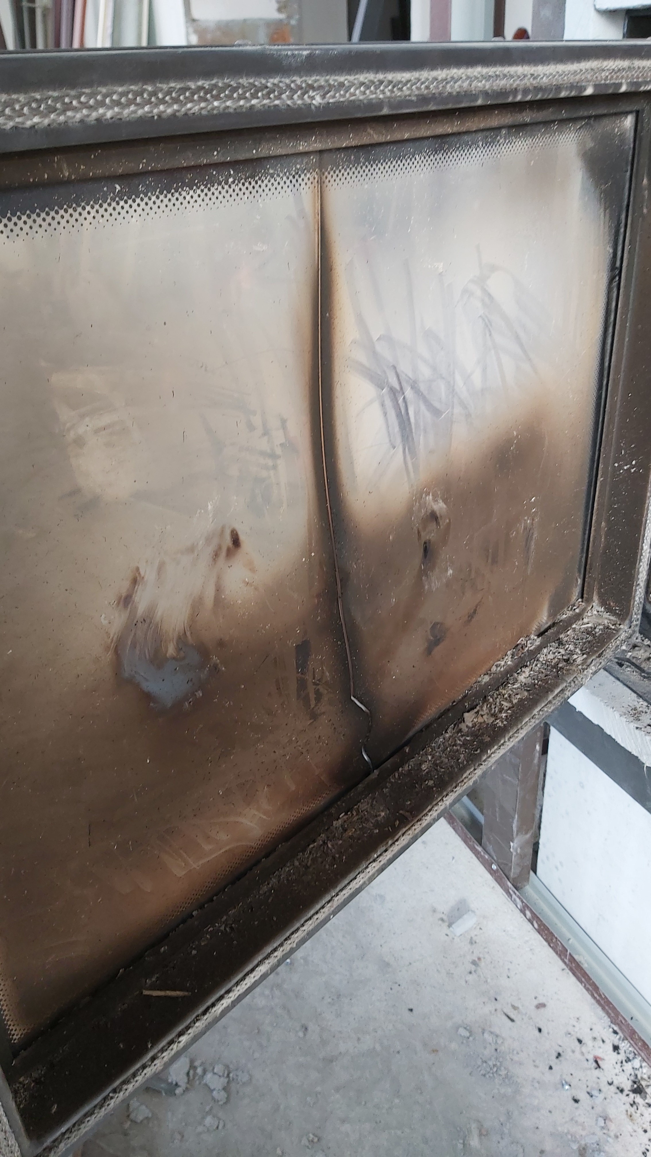 Топили строители мусором. Лопнувшее стекло. Поведенный от огромных температур металл. Суперизол заделан красным силиконовым герметиком.