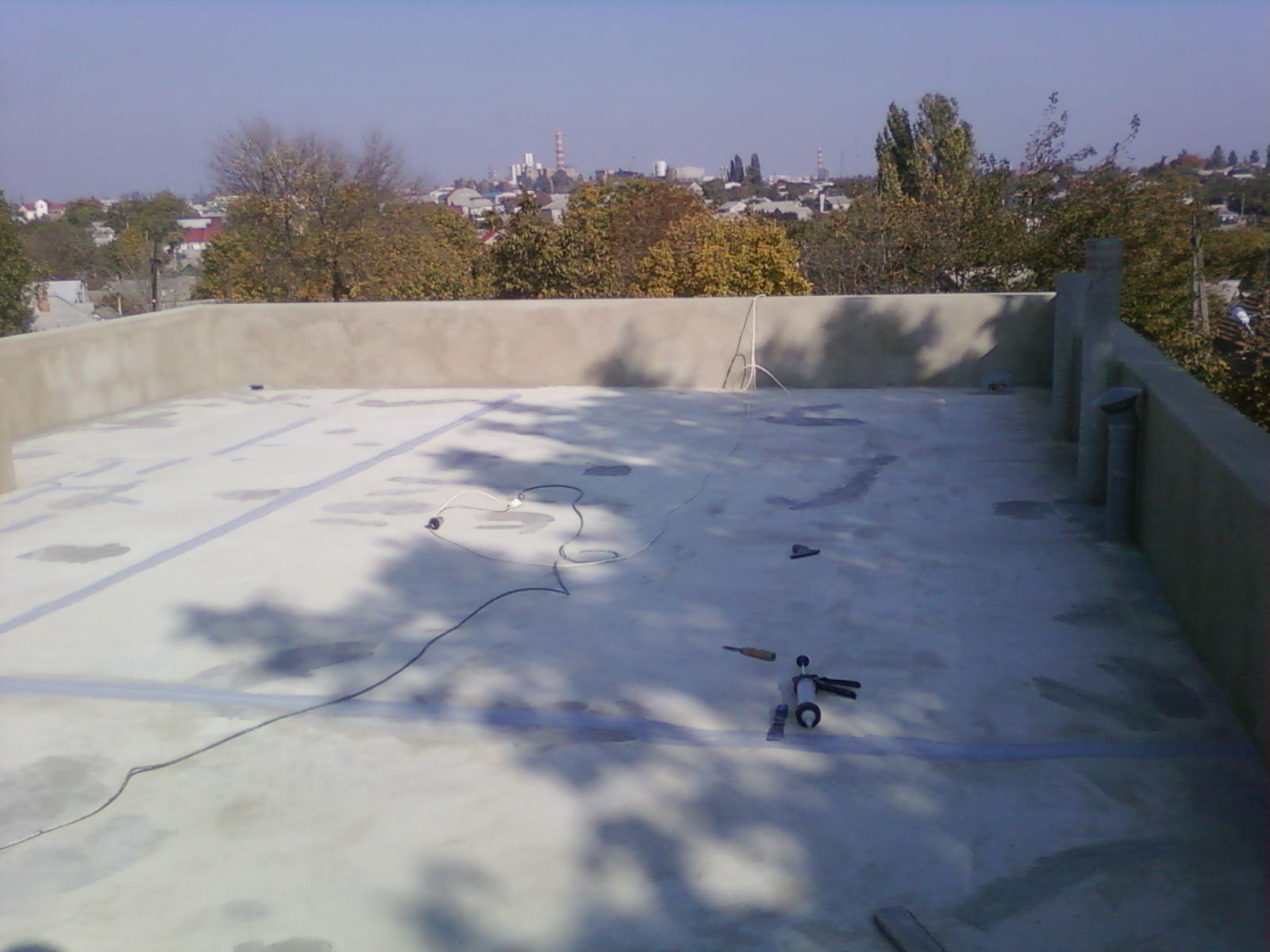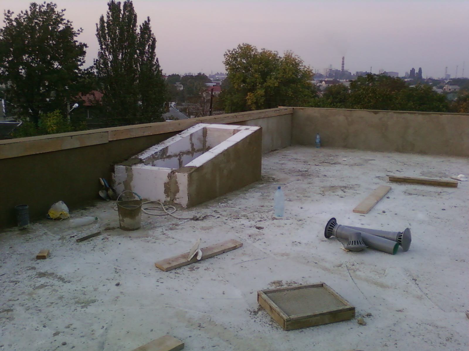 одессит-пиано-мастер Опубліковано: 29 жовтня 2011 Автор Поділитись Опубліковано: 29 жовтня 2011 Сегодня в последний раз закрасили крышу. Забегая вперед скажу, что песком обрабатывать передумали по двум причинам. Во первых, не увидели в начале нескольких трещинок и норок ( не знаю, как правильно называются эти дырочки в стяжке, может свищь). Они понемногу затягиваются. но, чую, что прийдется через день полазить по покрытию с лупой и шприцом. Заразы, когда замазывал - их не видно, а когда красишь, видно все, но поздно! Во вторых, по примеру Чайки, А вдруг трещина где откроется, на глади сразу увидишь, а на песке нет, а увидишь только когда намокнет плита в доме, а к этому времени уже и стяжка намокнет (а если на морозе, то и разрушится) и плита с полистиролом ( который не мокнет вроде). Короче, решили не рисковать. Итак искодник. Штукатурка [ATTACH][ATTACH][/ATTACH][/ATTACH] Пришел материальчик! Пробиваем отверстия для оттока воды. Я учел высоту пенопласта и стяжки. Сглаживаем песочком неровности плиты. Пенопласт и укладка стяжки. Пенопласт рассчитал десятку и пятерку обычного снизу и ЭППС сверху. Лесенкой. от17 см до 8 см общей толщины. Уклон - 1 см на 1.2 метра ( длина ЭППС ). Соответственно укладывали десяти сантиметровый 6 рядов (ЭППС поверх него 5 рядов 5+2, 3+3, 5, 4, 3, ) далее пятерка белого и ЭППС аналогично. Уклон маленький, но меня успокоило то, что был дождь, и вода собралась (по ровной плите) со стороны водостоков, так что (не знаю, ругать строителей или хвалить за кривую плиту,сам не знаю, как так получилось. Опалубку выставляли по водяному. Может растягивали больше к концу заливки) уклон уже был около трех см. Стяжку вообще просто. Пятерка квадратный профиль ложился на отрезки ЭППС 2 см ( всего 7см) и ложился на край каждого уровня разуклонки.(Раствор с добавлением суперпластификатора и микрофибры объемного армирования без арматуры). Вроде ничего получилось. Усадочных швов тоже не делали. Достаточно того, что трещинки кое где появились именно в местах стыка шагов стяжки. Это перетертая мной лично на другой день стяжка. (обычной фанерной досточкой снимал все наплывы и через неделю углубления (потенциальные блюдца)выравнивал церезитом. Ну а дальше (через две недели) все по сценарию. Грунтовка внутренних углов и трещин, замазка герметиком (гиперсилом) Посилання на коментар Поділитися на інших сайтах More sharing options...
