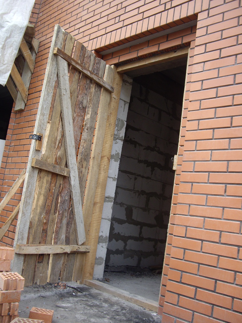 а я решил сначала поставить черновую дверь из доски, а как закончат фасад и черновую штукатурку- поставлю чистую дверь.