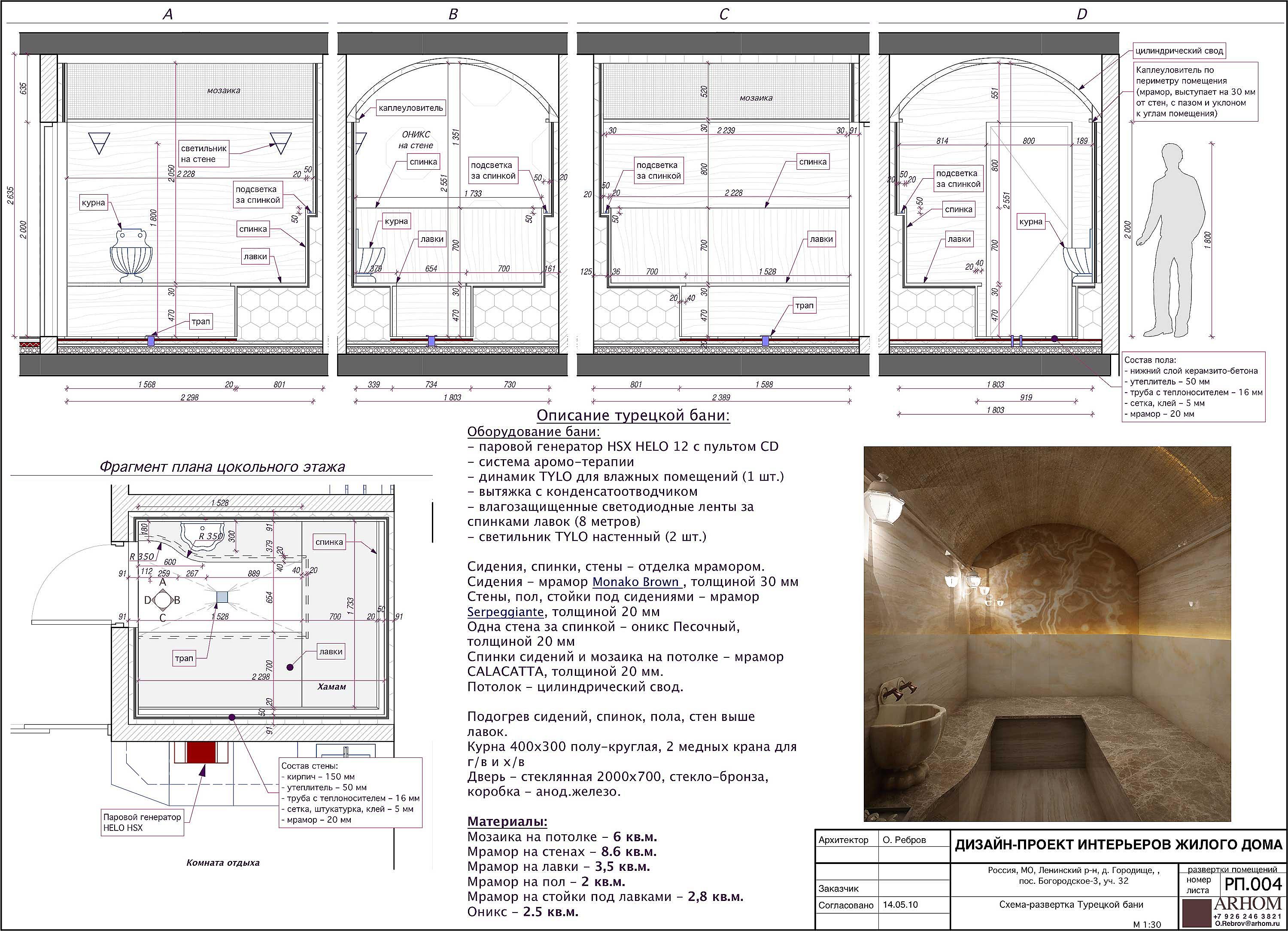 Kimura Опубліковано: 12 липня 2011 Поділитись Опубліковано: 12 липня 2011 В общем исследуя возможность постройки на даче хамама по крупинкам нашел небольшую но очень полезную информацию. Которой собственно и хочу поделиться. Первая ссылка - - мужик сделал хамам я так понял в квартире. Именно и этого сайта я вычитал что есть некая Луганская контора которая производит наши парогенераторы (ссылка устарела) Порывшись нашел "ту самую луганскую компанию" - Катарсис gorod.dn.ua/data/dbprice/price.cgi?cc=2&id=6503&words= Поговорил с директором Александром. Выяснил следующие цены Парогенератор 9кВт-12кВт -стоит 7000 гривен +-. Как сказал Александр промывать его не надо система може работать годами и проверена на практике. Но в идеале воду надо готовить - -тогда прослужит долго. Уже вижу себе блок фильтров перед парогенератором с катионной смолой как минимум для борьбы с кальцием. Дозатор ароматов - -сказал самый лучший вариант веник эвкалиптовый на форсунку - -и запах бует нормальный. Теперь тема "хамам под ключ" VIP комплектация - -купол, лампы, световоды, попсовая отделка с какой-то модной керамикой, лежаки, теплые полы и пр. - все стоит примерно 120 тысяч гривен комплектация премиум - материалы попроще - 90 тысяч гривен Комплектация эконом - -все самое дешевое по отделке вместо купола свод без световодов, но все вполне функционально - стоит примерно 80000 гривен. + ко всему транспортные и командировочные - -думаю еще набежит 1000-1500 баксов... Многовато... Ну где то так... На текущий момент не совсем понимаю инженерно 4 вещи: 1. Создание потолочного свода - как и из чего...Купол у меня не всунуть - - потолок из железобетонной панели, соответственно доступен будет только свод. Какие материалы что бы укрепить и что бы не отсырел ? Гипсокартон водозащищенный -врядли подойдет. Экструдированный пропилен ? 2.Полки- лежаки с трубами "теплый пол" - как их сделать крепкими и надежными? Как сделать форму, какие использовать материалы? Там вес неслабый - -как сделать так что бы не упало ничего? Либо заливать все до уровня седушек и вылепливать скругленный седушки по лекалу ? Пока не понимаю... 3.Отделка стен гидроизоляционными материалами - -нашел несколько интересный материалов, но не понятно сколько они стоят панели плит-панелей DOIT или WEDI - вроде в Украине их не продают, а если продают - -то как бы на них глянуть.. И если клеить их на стены - -то как монтировать в стенах теплый пол - до или после панелей ? Если до - -то будет ли греть ? Если после - то как потом и чем натягивать стены ? 4. Вентиляция -как сделать вентиляцию правильную ? просто вентилятор вытяжной или система клапанов ? Народ !буду рад если есть наработки которые Вы сможете выложить и поделится опытом... Из текущих фоток вижу простой и понятный по отделки вариант который прикладываю - скорее всего у себя буду делать так... Из той философии которую надо делать в хамаме понимаю обязательное наличие следующих вещей в хамаме: 1. Полка для сидения развалившись - -такое себе анатомическое сидело.Самое сложное. 2. Мраморная полка для массажа с подогревом (обязательно мастхев!)- отечественный мрамор подойдет 3.Курна - умывальник по нашему с холодной-горячей водой.Сожно просто умывальник 4. Душевой шланг гор.хол. вода- периодически омывать себя разопревшего 5. Стоки для воды со стен и свода боковые на стенах 6. Дренажи со стоками в седушках 7.Центральный сток 8. Аромамашинка - -можн