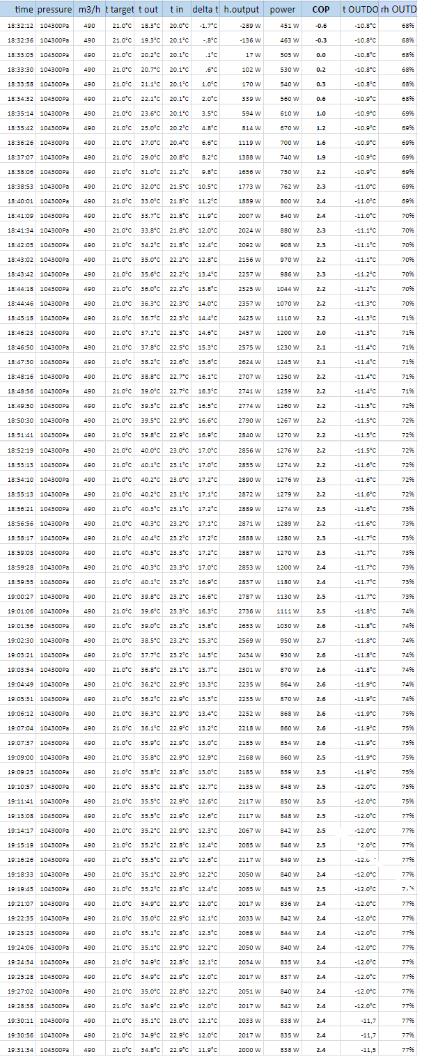drinkens Опубліковано: 30 листопада 2018 Поділитись Опубліковано: 30 листопада 2018 Cнаружи от -11С до -12С, т.уставки +21. Окончания цикла за час не дождался, так как видимо кондер вышел на уровень близкий к паритету потерь-генерации, и выключаться не собирался. Магистраль 15м. Скорость высокая 490м3/час. Средний СОР за час 2.29, но так как это не завершенный цикл, то средний за цикл будет выше. В последние пол часа СОР около 2.48 при -12С. У меня кондер сдулся этой ночью. Утром было -15, работал на максимуме (2квт) - больше 20 градусов не нагрел 70 квадратов. А чем меряете - это к мидее софт какой-то идет ? Или свои наработки ? Посилання на коментар Поділитися на інших сайтах More sharing options...