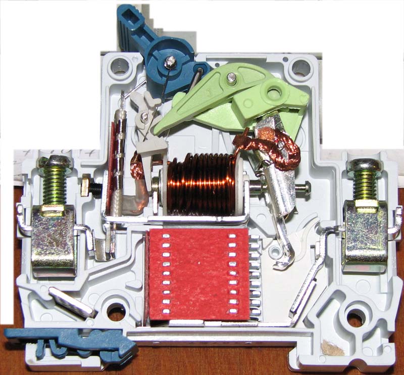 Kamikaze Опубліковано: 16 січня 2012 Поділитись Опубліковано: 16 січня 2012 Moeller PL4 C10 Автомат запечатлен в положении после автоматического отключения, с "клювиком", зафиксированным в положении "Вкл". Контактные части зажимов - медь или медный сплав с покрытием. Остальные токоведущие части - штампованные из медненного стального листа. Соленоид, плетенка и подвижный контакт, разумеется, медные. По сравнению с АсКо, ВМ40 и IEK обращает на себя внимание миниатюрная напайка на неподвижном контакте. Такая экономность вообще характерна для брэндов. Радует большое кол-во пластин деионной решетки дугогасительной камеры, что в сочетании с отличными условиями для сбегания дуги между контактами в оную камеру должно обеспечить очень малое время гашения дуги после размыкания контактов. Посилання на коментар Поділитися на інших сайтах More sharing options...