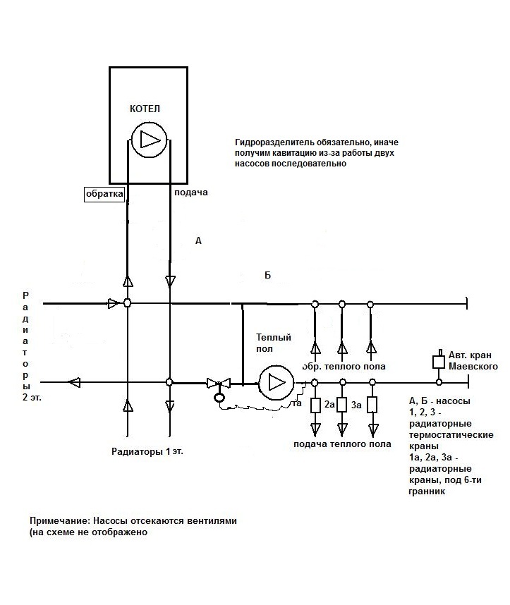 Алексей27 Опубліковано: 19 листопада 2012 Поділитись Опубліковано: 19 листопада 2012 П.С. Если есть желание и финансы сделать все по канонам - схемка в приложении [ATTACH]229087[/ATTACH] Присмотрелся к схеме повнимательней, есть возражения! Во первых нельзя ставить радиаторные термокраны на ТП!!! Если так уж сильно хочется можно поставить краны типа RTL, но не радиаторные! А если их не ставить то байпас не к чему! во вторых надо учесть если ставить насос после гидростелки то у него должна быть достаточная мощность (превосходящая мощность котлового насоса, т.к. котловой насос не справляется) Но я бы все равно начал с того что отключил ТП и вспомогательный насос(оба) и посмотрел хватает ли котлового насоса только на радиаторы! Добавлено через 9 минут Котловой насос не тянул потому что ему не хватает напора для преодоления гидравлического сопротивления системы. Отсутствие смесительного узла здесь ни при чём Только давайте не будем говорить что кто-то разбирается в гидродинамике))) Это не серьезно! поставить диагноз по такой схеме ни возьмется никто!))) Я за один поход в Сильпо в четыре раза больше трачу. Никто не возражает)) Узел смешения не избавит от необходимости насоса в узле теплых полов. За счет чего Вы хотите окупить стоимость смесительного узла и стоимость работ по его установке? Смесительный узел подразумевает наличие насоса, то есть это насос+ устройство смешения+.... Чем глубже понимание Тут все зависит от понимания заказчика. Посилання на коментар Поділитися на інших сайтах More sharing options...